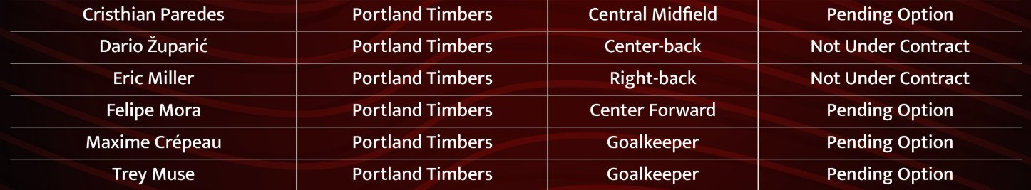 Here are the players whose contracts expire at the end of the season: David Ayala, Diego Chara, Felipe Mora, Dario Zuparic, Maxime Crepeau, Cristhian Paredes, and Mati Rojas. The entirety of the supplemental roster (Gage Guerra, Eric Miller, Trey Muse, James Pantemis, Ian Smith, and Hunter Sulte) are also on expiring contracts. Some of these players have options (Ayala, Chara, Mora, Crepeau, Paredes, Guerra, Muse, Pantemis, and Smith).