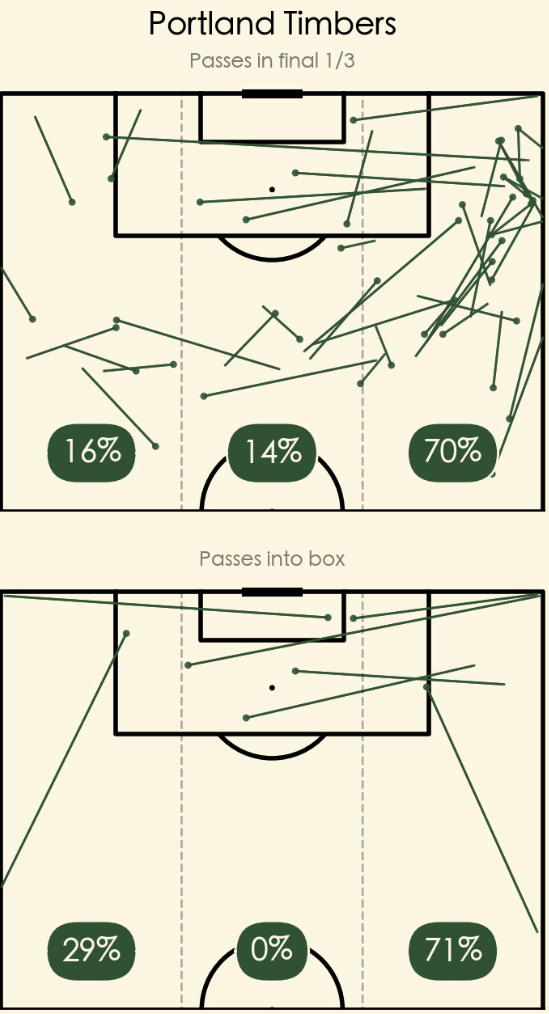 The Timbers lost the box tilt battle for the second game in a row. The final tally of 37-15 is a bit misleading, considering the Rapids played with a man advantage for the final 20 minutes of game time and used that period to make incisive movements into Portland’s box. During the first half, the Rapids had a 19-10 advantage in this category. Three of those touches were shots from set pieces. Colorado had 8 corners in the first half, most of which were created by quick progression through the wings.