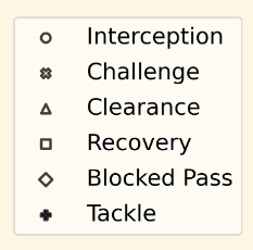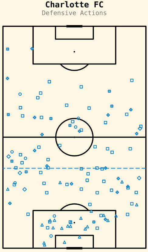 This data comes from the first 41 minutes, which is the entirety of the time Miguel Araujo was on the pitch. According to the match momentum chart, this period of time is when the Timbers enjoyed their best spell of play. Phil, if there is no ball progression problem, why is the darkest line on this chart connecting Zac McGraw and his own goalkeeper? Why is there almost no connectivity between the midfield and the attack? Even worse, why is there almost no connectivity between the defense and the midfield? This chart only measures completed passes, and when you add in a map of Charlotte’s defensive actions the picture becomes a lot clearer.