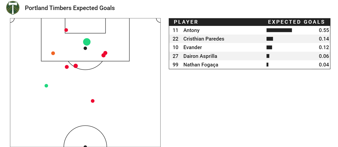 Cristhian Paredes and Diego Chara both had solid games. Even though the pitch was small, they still had a lot of ground to cover due to the pacey NYCFC attackers trying to get in behind. Antony scored his third goal of the season and kept running all over the pitch. Santiago Moreno has been a huge beneficiary of the new coaching staff. He did a lot of damage on the left side of the Timbers’ attack, leading all players with 5 completed dribbles. Eric Miller was solid at left back again. Nathan Fogaca was the only substitute to make a substantial impact, and his introduction allowed the Timbers to get more vertical.