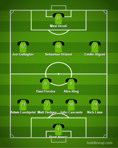 Driussi has really come back to Earth following his MVP-level campaign a year ago. Maybe he shouldn’t have taken the number 10 jersey. Jon Gallagher is normally a fullback, but he’s been one of their best goal threats, so Wolff has been playing him farther up the pitch. Two former Timbers are listed here, with Julio Cascante pairing Matt Hedges at center back. Maxi Urruti has to start. Hedges came to Austin in a mid-season trade with Toronto, and he is an upgrade on Vaisanen. Pereira and Ring are a solid midfield pairing. Rigoni has massively underperformed as a DP. This is Austin’s best team, and they need to be starting for the Verde-and-Black.