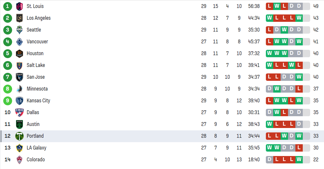 I’ve already spoken at length about the Timbers’ problems if they allow the first goal. The Seattle draw on September 2nd was the first game all season that the Timbers scored first on the road and still got a result. It was also the second time all season that they got a result after conceding the first goal on the road. They still only have one road win, and they need more in order to make the playoffs. The Timbers have only played at Q2 Stadium three times. The first two matches in 2021 were losses. I’m willing to excuse the first one because it was the first Austin FC home game in the venue. Last year, they won 2-1 at Q2, giving them a combined 1-0-2 record there. It’s not a massive sample size, and there is a history of the Timbers falling flat in Texas (I don’t need to remind you of the last time we played there). Despite the absence of Diego Chara, there is still a reason to be optimistic. Especially with the added motivation of taking down a playoff rival. Speaking of playoffs, how’s that table looking?