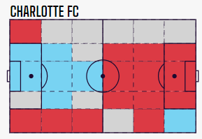 This map comes from OPTA, and it illustrates the various zones of control for each team. The defensive third is on the left, and the attacking third is on the right. If a zone is blue, it means that the selected team has the majority of touches in that zone. If the zone is grey, the zone is contested. And if the zone is red, it means that opposing teams have the majority of touches in that zone. Charlotte’s map is indicative of a counter-attacking team. They allow opposing teams to have the majority of touches in their own half, and cede plenty of room to teams on the wings. Specifically, the left wing. Where Rodriguez plays. The Timbers need to get him involved early and often because the map indicates that he will have plenty of time to cook. Portland is very accustomed to using the right wing to launch attacks, but they will need to use both wings in order to break down Charlotte’s stubborn defensive block.