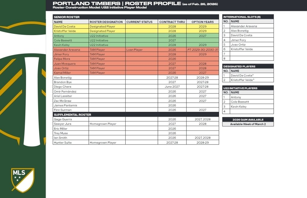 The 2/4 model has been confirmed, and the Timbers currently have an open U22 slot. David Da Costa and Kristoffer Velde are the DPs, while Antony, Cole Bassett, and Kevin Kelsy are on U22 deals. Aravena joins the team as a TAM player, joining Jimer Fory, Felipe Mora, Juan Mosquera, Kamal Miller, and Joao Ortiz on that designation. Ortiz wasn’t a TAM player last year, but I theorized that the Timbers used a fair amount of GAM to buy down his massive raw cap hit. This year they used TAM after the departure of Dario Zuparic freed up significant funds in that area.