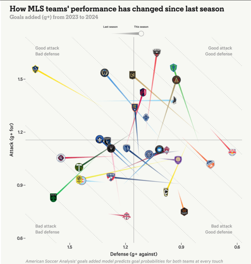 This chart comes from The Athletic, and it looks like the Timbers have regressed from last season. They are firmly in the “bad attack, bad defense” category. One of those (bad defense) is certainly true. But the other important numbers (like goals scored) completely disagree with the advanced metrics. The Timbers have scored 16 goals in 8 games in 2024, which puts them at an even 2.0 goals per game. Meanwhile, some teams firmly in the “good attack” category are severely underperforming the advanced metrics. Seattle is a perfect example of this. Despite an outstanding Goals Added number, 4 of their 9 goals have come from the penalty spot. It is still very early in the season, but Portland’s offensive overperformance has been keeping them afloat. But how much are they really overperforming?