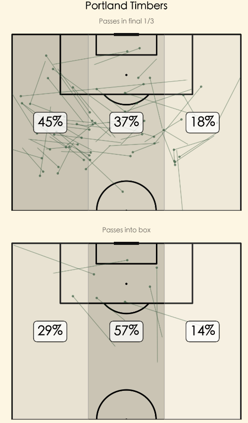 This is not a bad thing, but it is something that definitely happens. Since Rodriguez locked down the starting left wing job, other teams have begun to double-team him on the wing. This has been very effective as of late. It is compounded by Bravo not going forward and giving him support on the left. To contrast this, Moreno doesn’t often face double teams on the right but he always has Mosquera as an outlet. Earlier in the year, I was worried that the Timbers were too reliant on the right side of their attack. You can imagine my surprise when I saw these maps after the game.