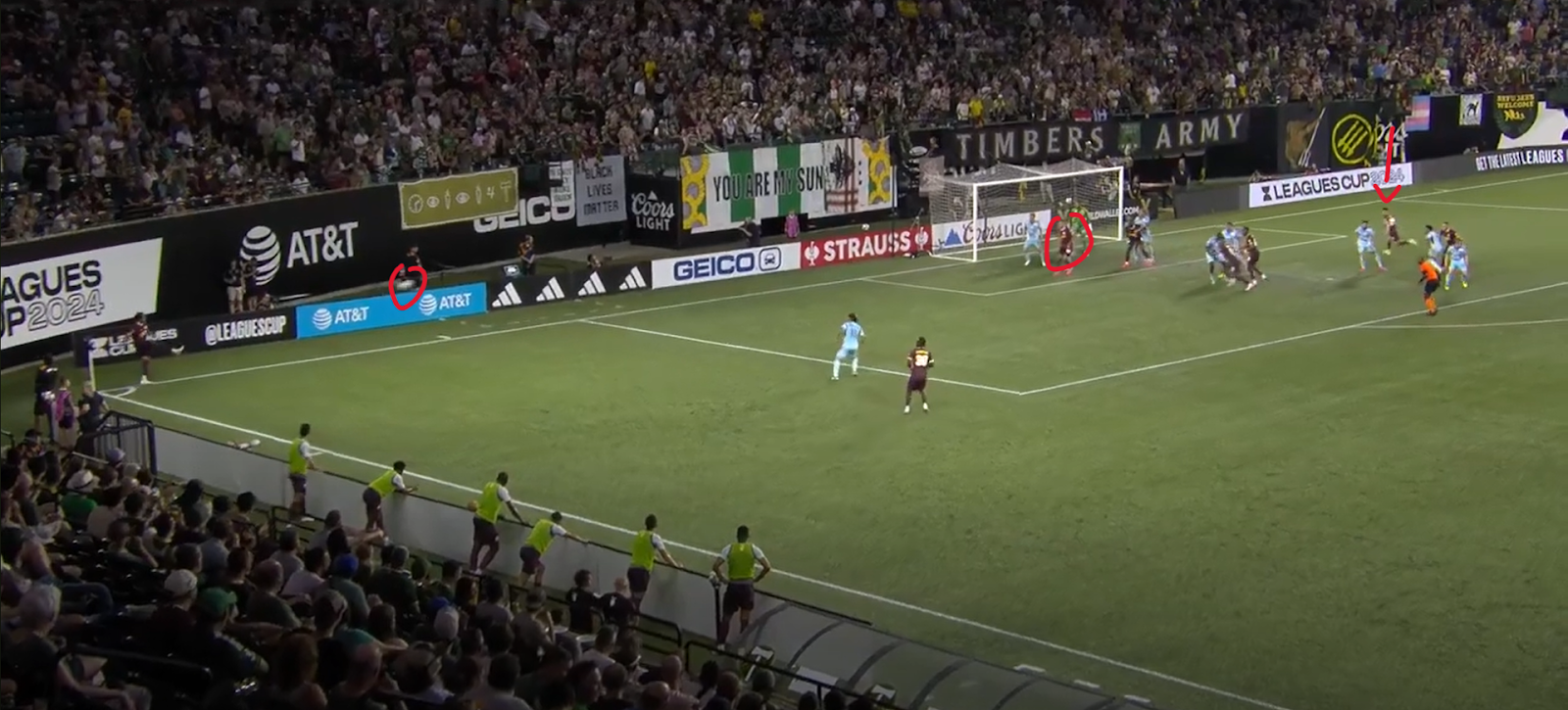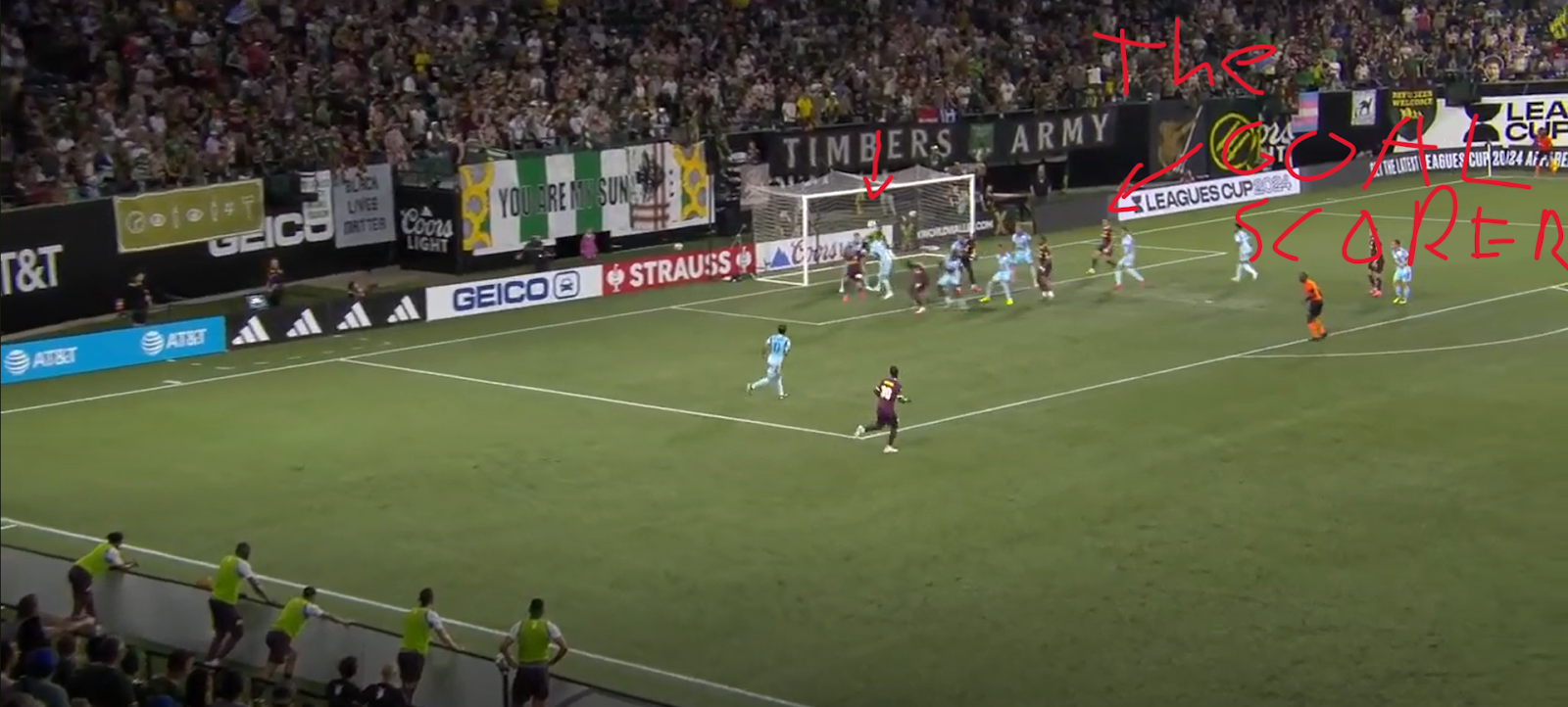 Fast forward a couple seconds and Paredes has headed the ball (marked by a very helpful arrow) to the back post. This is the proper way to do a corner kick routine when you don’t have a literal giant (Zac McGraw) on the pitch and several capable aerial threats defending the corner (Bombito, Maxso). Defenders are always focused on the initial cross (or entry ball) during a set piece. Just like how Sam Vines (the “S” in Scorer) has completely lost his mark (Ayala, helpfully labeled “The Goal Scorer” with a nifty red arrow) which allows that player (Ayala, the Goal Scorer) to get to the back post and be right there to head home Paredes’ clever pass and score the goal! Over the years, the Portland Timbers have routinely been victimized by these exact corner kick routines. It was so satisfying to see them repay the favor tonight. The near-post flick is the most effective corner kick routine. It changes the angle of the attack in a split second and is always an instant goal if executed correctly. More of this, please.