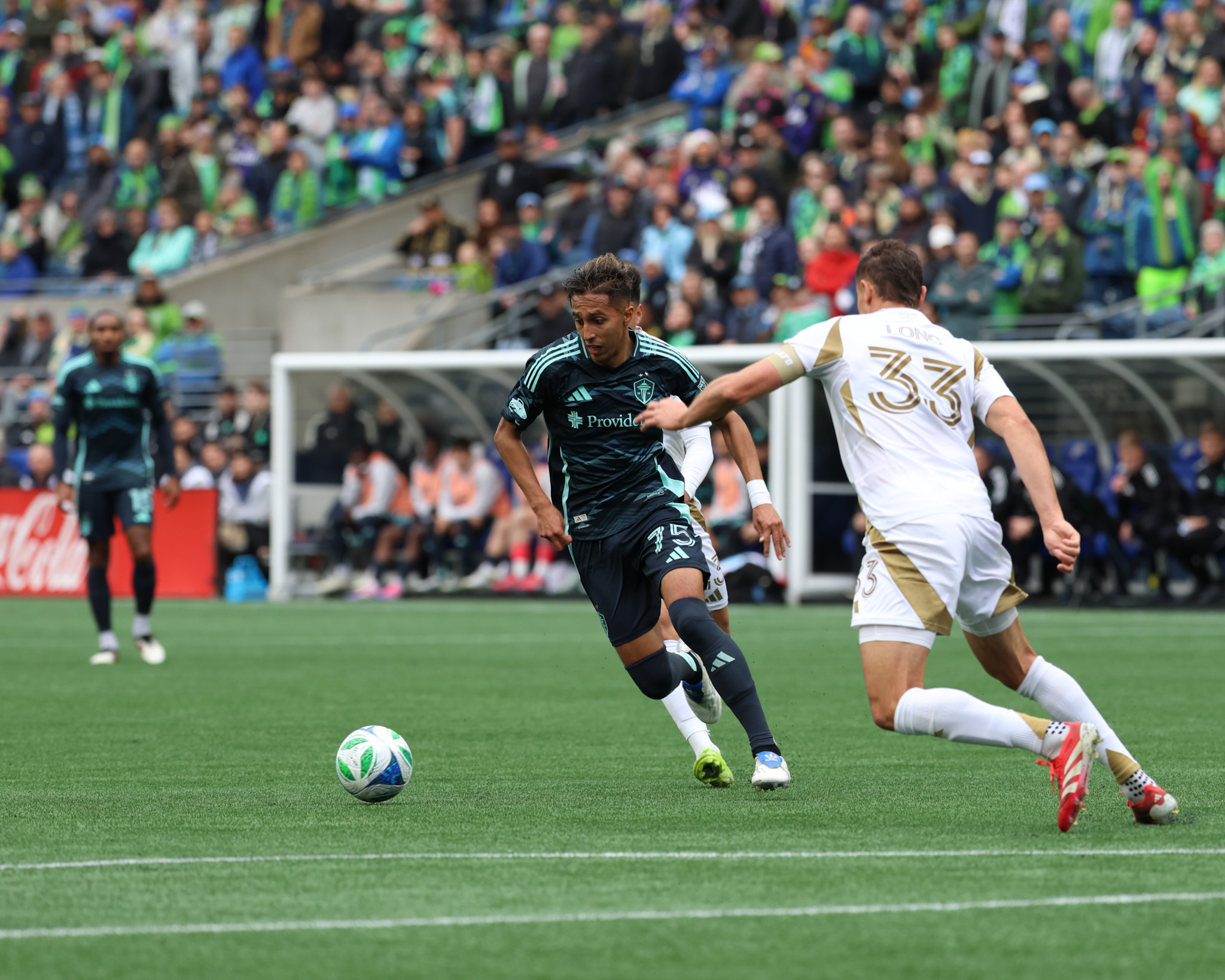 The match started a bit slow, with both teams trying to feel each other out. A few positive passing sequences here and there from the Sounders, but nothing too dangerous. That was until the 10 minutes in when Jon Ball starts the play with a slightly over-hit pass to an open Jesus Ferreira, who then plays the perfect over-the-top through ball to Tacoma Defiance loanee Kalani Kossa-Riensi, who beats Artem Smolyakov in a footrace, sits his ass down, then slots it home to the far post past Hasal to make it 1-0 to the Sounders. The goal set the tone for a get-right game against LAFC. Minutes later, LAFC had a chance to level the game, but Kossa-Rienzi was putting in the defensive work as he put in a block inside the area to deny a dangerous shot.