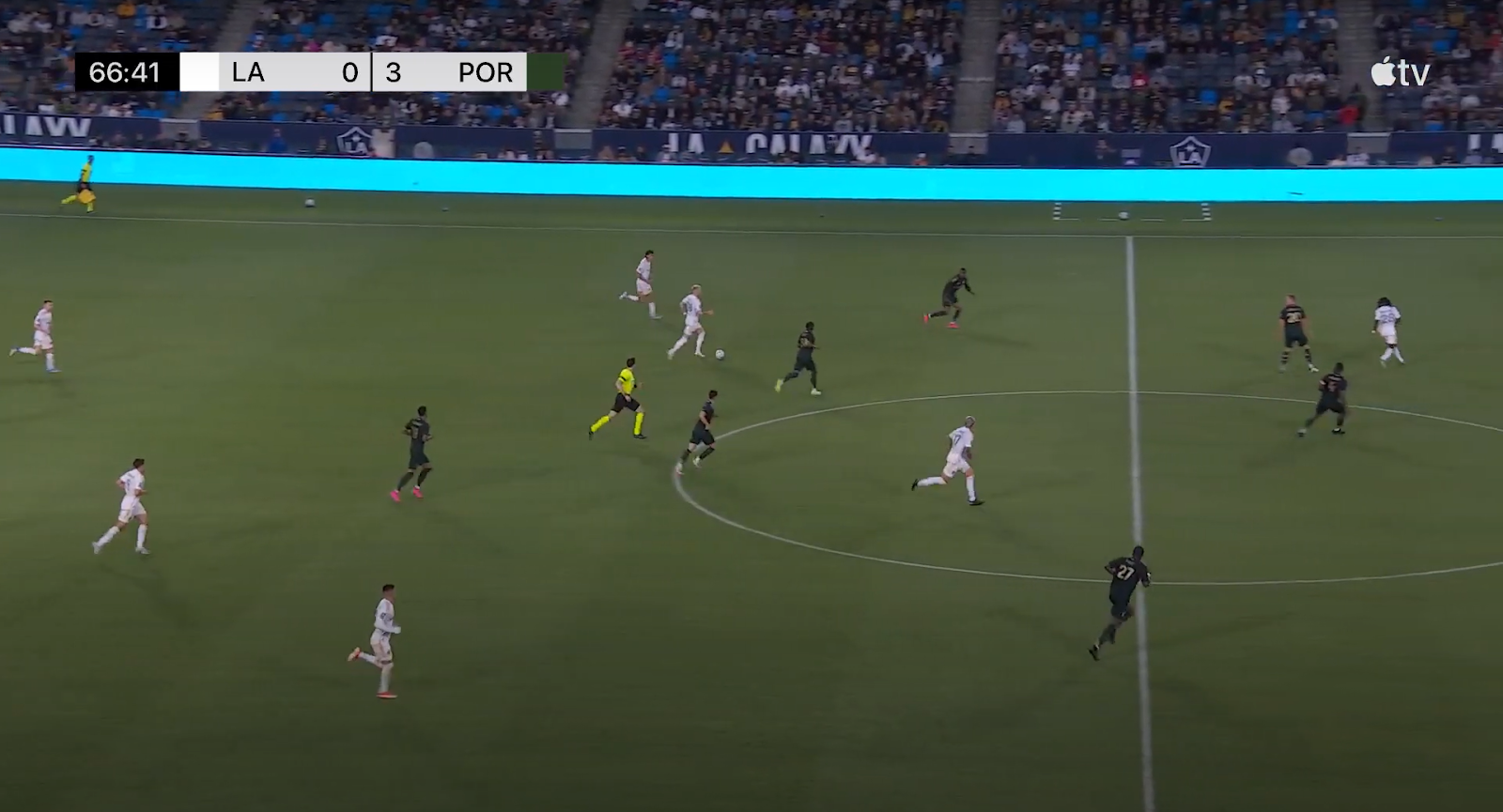 In my preview of tonight’s game, I singled out how Portland’s fullbacks should be set up to deal with LA’s wide threats. My thesis: Fory should stay back to keep Pec in front of him and not risk any yellow card opportunities. Lo and behold, that’s exactly what the Colombian did. And he didn’t pick up a yellow card either! He did pick his spots to go forward as well. By the way, Portland’s positional back three (Fory, Miller, and Surman) completed a combined 118/124 passes. Nearly flawless in possession.