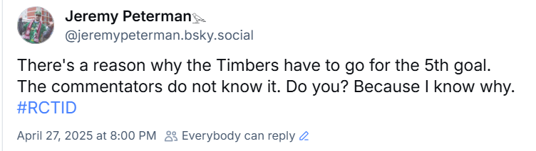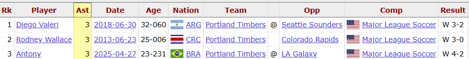 The quest for the elusive hat-trick will continue, but the Ass-hat (assist hat-trick, for clarity) should be treated with reverence as well. He joins Diego Valeri and Rodney Wallace as the only Timbers with an Ass-hat in MLS play. Congratulations to him. All three of his assists were earned, and his outstanding start to 2025 has seen two different bursts of plenty.