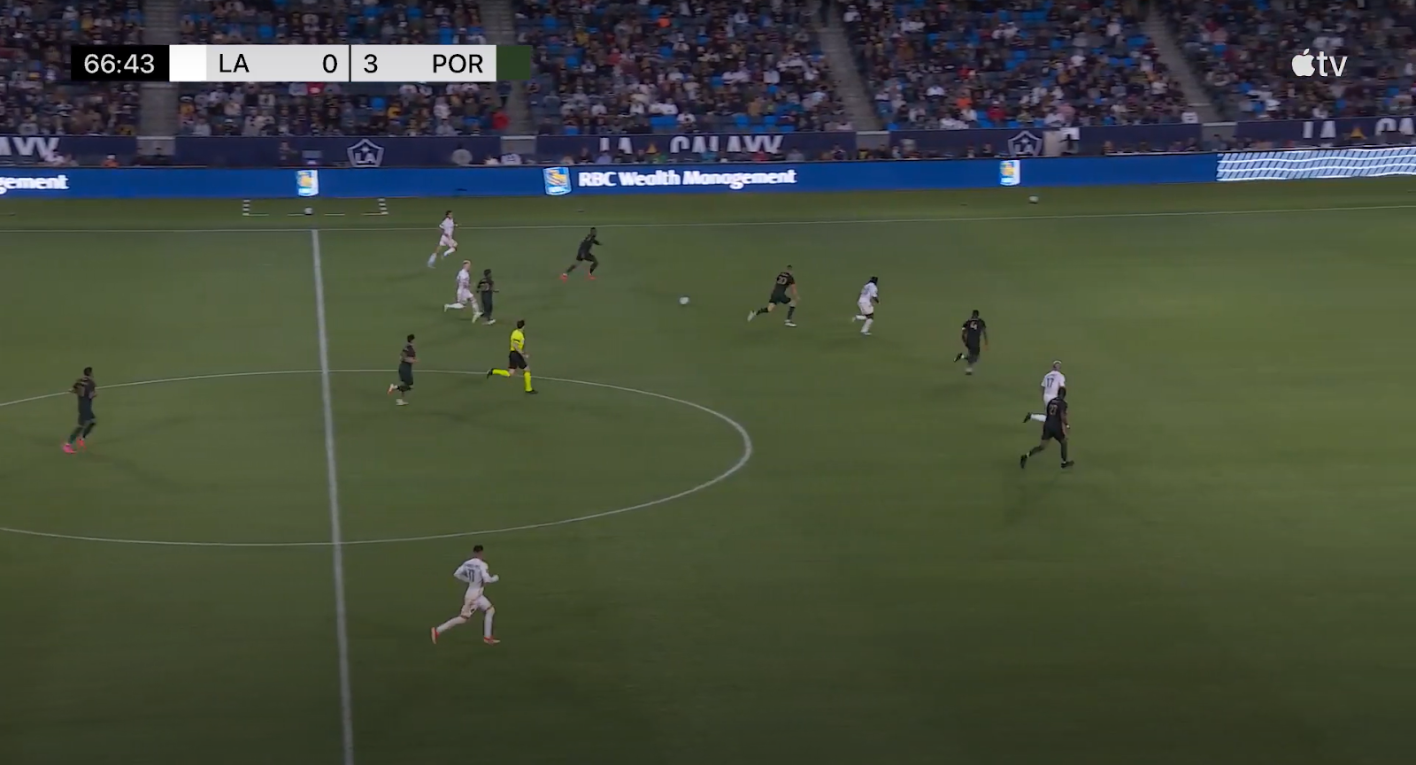 We begin in the 67th minute with a turnover at the top of the box and Lucas Sanabria on the ball. Portland will be facing a counterattack with a 3v5 advantage.