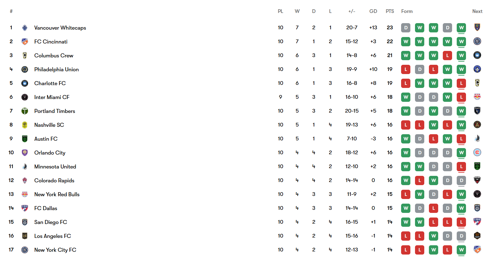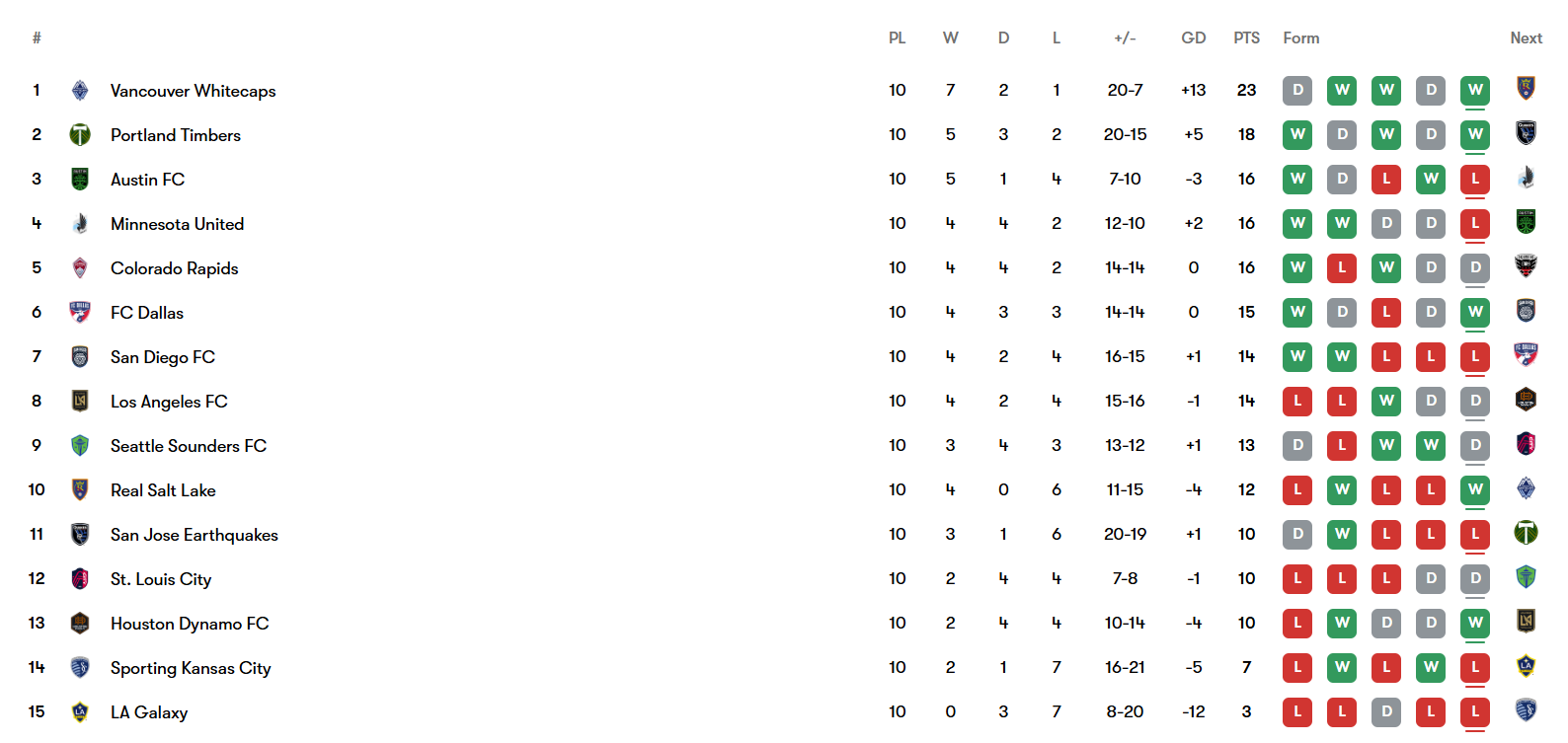 The Portland Timbers, in their 50th anniversary season, are second in the Western Conference as the calendar turns to May. They are currently on a seven-match unbeaten streak, which is the longest such streak in the Western Conference. They are two points clear of second-placed Austin and four points clear of tenth-placed RSL. In addition, they are five points behind conference-leading Vancouver. They are also tied with those same Vancouver Whitecaps with 20 goals scored, which is the most in the Western Conference. Did someone ask for a second table?