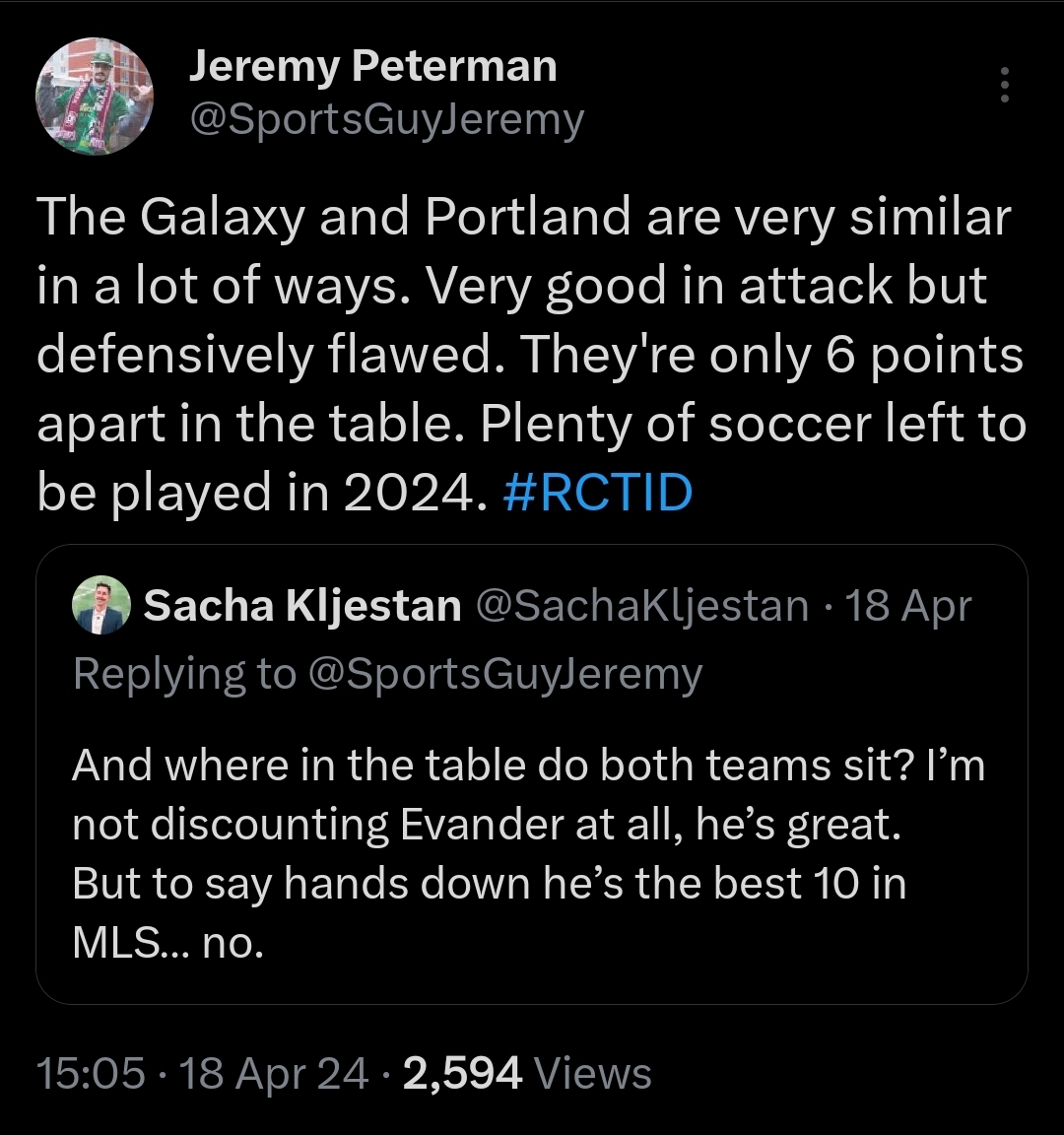 This is from mid-April, when the Timbers were almost halfway through their winless streak. Fast-forward to now, and now the two teams are now 10 points apart in the table (although the Galaxy have played one more game than the Timbers). Portland’s resurgence has been due to structural defensive improvement. LA still has a way to go there. Bottomline: these teams are very similar to each other. The Galaxy’s top-tier talent has been able to overcome that while the Timbers were still figuring out how to fly the plane. Let’s check back in with this on September 18th when these two teams play again.