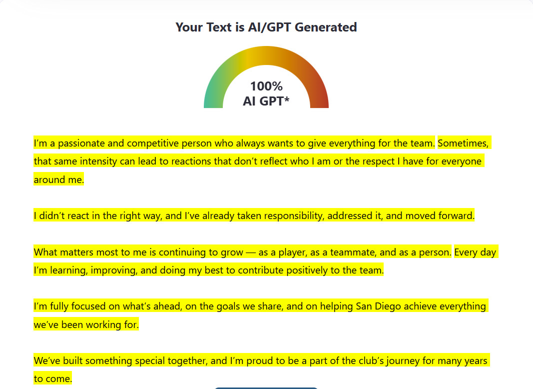 The red flag is the language of choice. Although San Diego is located in America, and the majority of the population speaks English, you’d think that Lozano would opt to write this in his native tongue. Most social media websites have translation functions, so any non-Spanish speaker would be able to get the message. But Lozano didn’t write this at all. He prompted it.