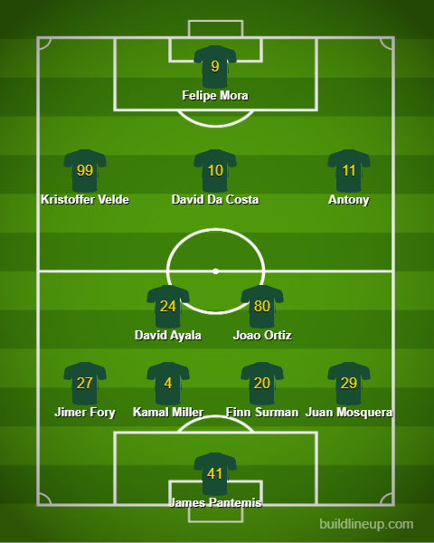 It’s hard to dislodge any of the starters from Wednesday. Diego Chara might be the exception, but he will see the field tomorrow in some capacity. This is a big game for Antony, while Velde and Da Costa get some more time to gain some chemistry in the positions that Phil Neville has always wanted them to occupy. Mora’s midweek brace gets him another start up top.