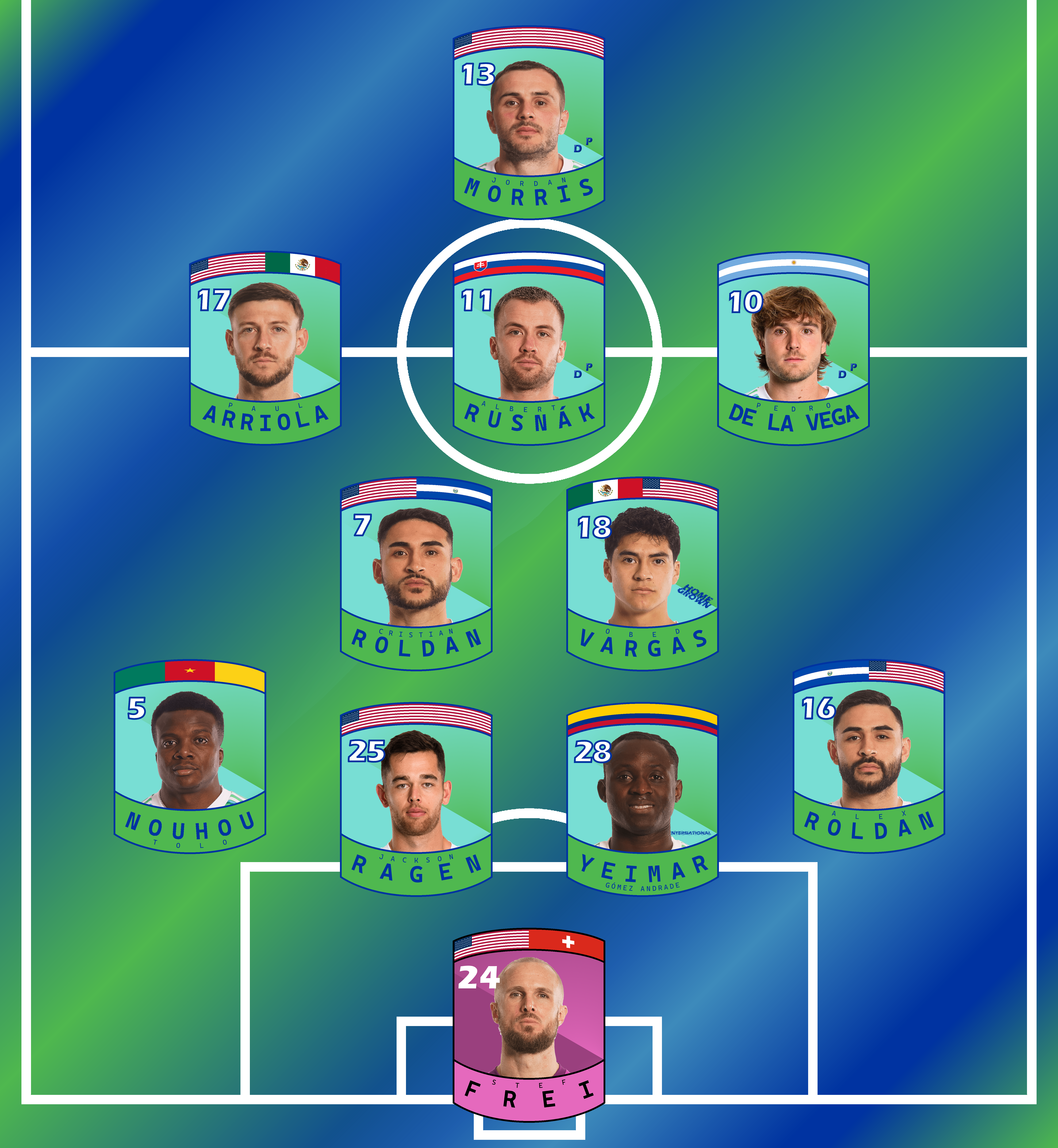 In at keeper was Stef Frei, as to be expected. The backline was all the usual starters: Yeimar and Ragen as center backs, Nouhou at left back, Alex Roldan at right back. Obed and Cristian were the holding midfielders, also expected. The three offensive midfielders were Arriola at left wing, Rusnák at number 10, and Pedro as a right wing/playmaker. I personally think that trio heads the depth chart in their positions. Jordan, of course, was striker.