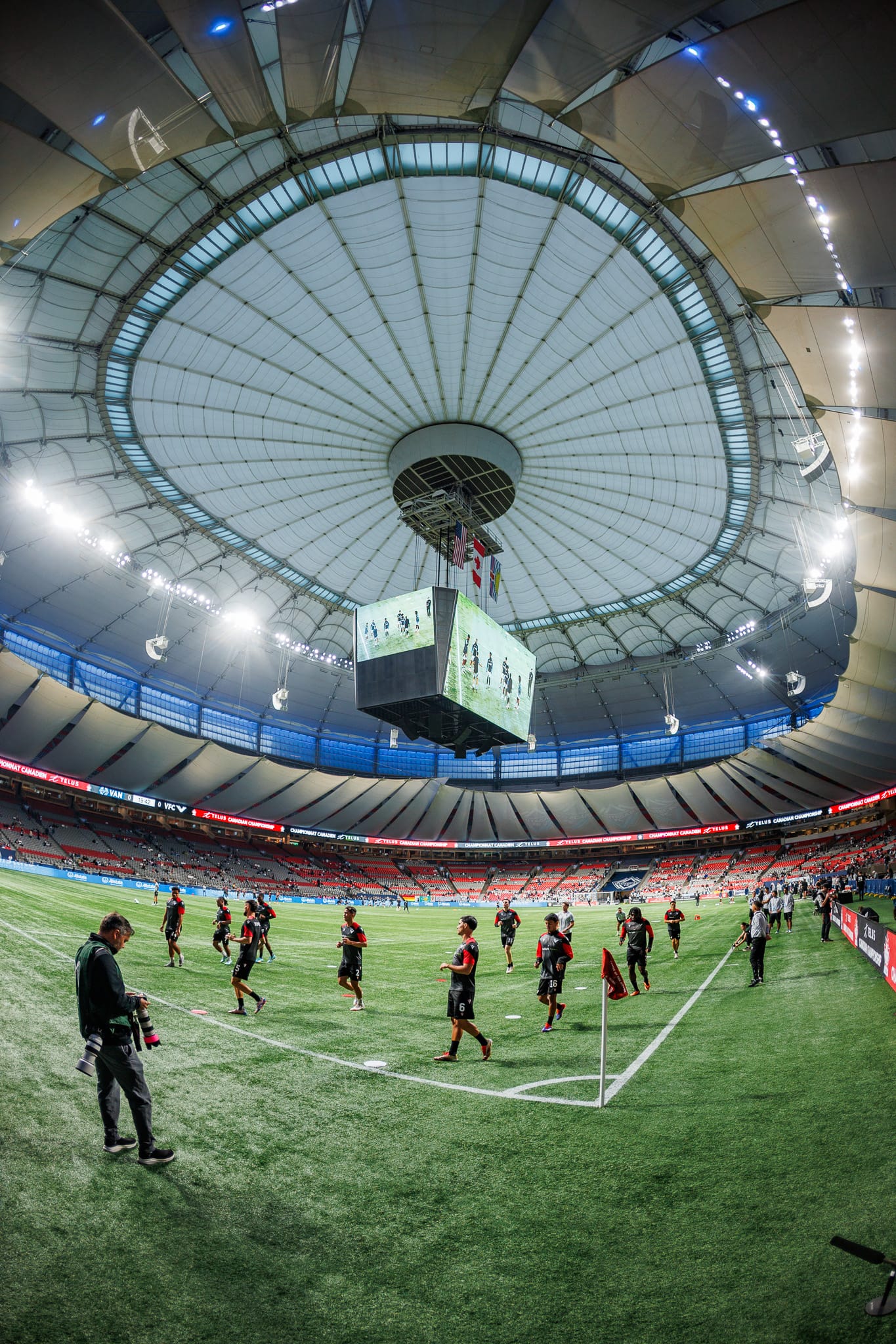 Early warm ups, walk out, and the first glimpse at the prize to pay for; The Voyagers Cup. Image Credit: Alex Bowen / Cascadia FC