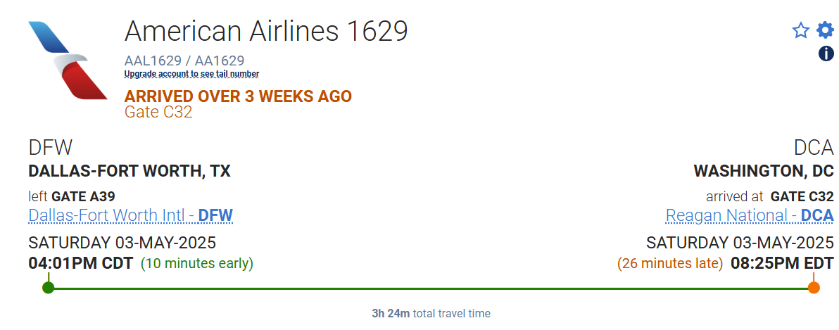 Flight time DFW-DCA (he’s not flying into Dulles lol): 2 hr 50 minutes