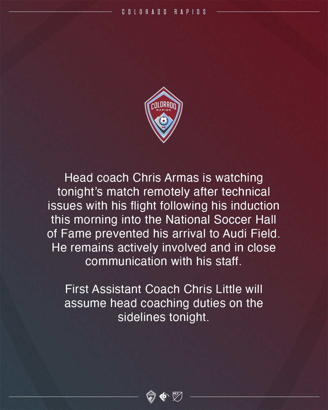 Prior to that game, head coach Chris Armas was inducted into the US Soccer Hall of Fame. Congratulations to him, it’s fully deserved. But there was a major problem. This ceremony took place in Dallas, and the Rapids were playing in DC later that night. There was a plan for Armas to get to the nation’s capital in time for kickoff. I’m going to spoil the ending here: Armas will not be on the sideline for the DC game. And it’s worth exploring how that outcome became a reality.