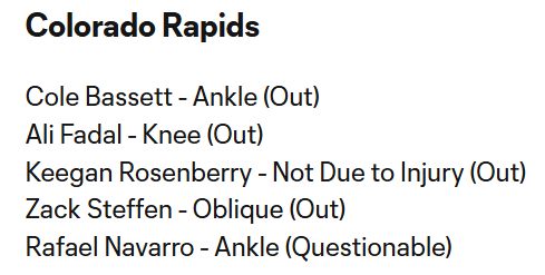 Steffen and Bassett’s absences were expected. It’s still an open question what’s going on with Rosenberry, who is the team captain. Navarro’s status is the most interesting. The Brazilian striker missed the 1-0 victory against St. Louis last weekend.