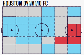 Based on this chart, Houston has been able to dominate the midfield. But what really worries me is their domination of the wings in their own attacking third. One weakness I have noticed over and over again for Portland’s defense is the ability for opposing runners to make unmarked runs through the channels. It happens on both the left and the right, and sometimes it’s unclear who is supposed to be tracking those runners. Normally, the fullback on either wing is responsible for defending the ball-carrier, but it’s anyone’s guess who is tracking the space left behind the fullback in the box. Houston’s wings have been underperforming, but they are still very dangerous because they aren’t afraid to attack space. Portland will have to defend as a unit in order to nullify Houston’s ability to attack the box. Tracking those runners will be of the utmost importance.
