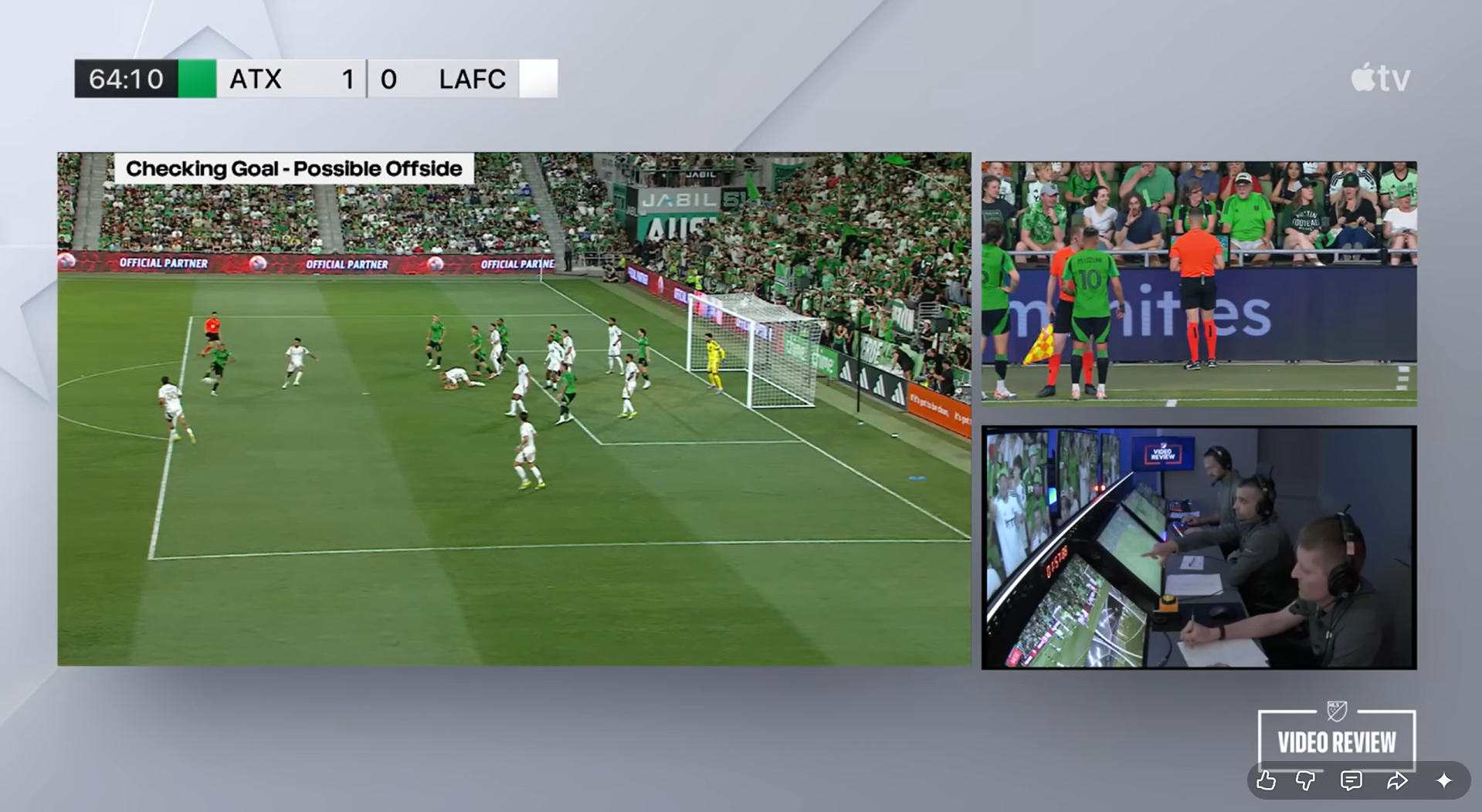 Now we return to this Austin game, with Uzuni celebrating in front of a packed supporters’ section. The VAR official is checking this play, as is the procedure for every goal. Something is spotted in the box: a potential offside and, by extension, interference.