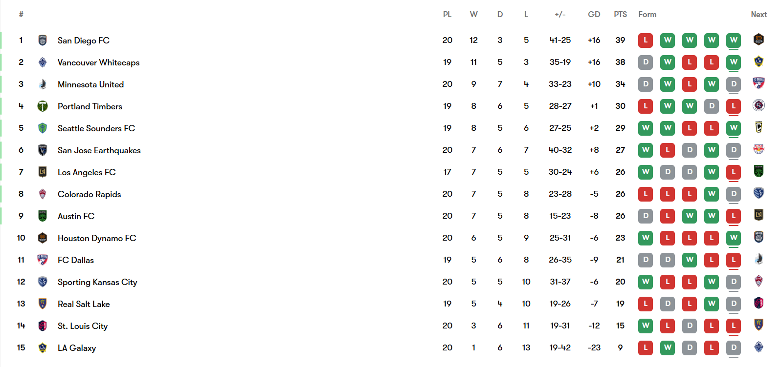 The former MVP is still New England’s best player with 7g/3a in 18 games. Phil Neville called him “the most consistent DP since I started managing in the league” on Thursday. It’s hard to argue with that. No matter how good or bad the Revolution are, Gil is always producing. The defensive solidity provided by the back three is enhanced by Aljaz Ivacic. The former Timbers goalkeeper was picked up by New England following his release in 2024, and is having another career year. So far, Ivacic has 7 clean sheets (4th in MLS) and is saving 74.6% of the shots on target he has faced (6th in MLS). The wingbacks (Feingold and 17-year-old Peyton Miller) provide width and quality service from the wide areas. In addition, the double pivot of Matt Polster and Alhassan Yusuf has been excellent since the back three was implemented. Porter found a system that has been getting the best out of the players he worked so hard to bring in during the winter. Although New England’s table position isn’t great, they have a solid foundation and a true difference-maker in the attack.