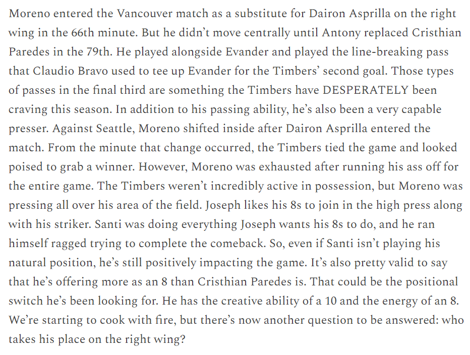 This was a lot harder for me to make than I thought it would be. But the more I look at it, the more I’m nodding my head. Evander and Diego Chara are the only two locked-in starters here. After the 2-2 draw in Seattle, I tried my best to build a Timbers XI that could make the playoffs. A key part of that XI was Santiago Moreno as an 8. Here’s an excerpt of my thoughts on him in the midfield: