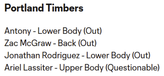 Lassiter’s status is the only change from last weekend. Kamal Miller isn’t listed here, but he’s suspended due to yellow card accumulation.