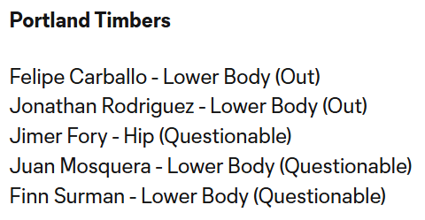 Fory is still questionable. Mosquera is a late add after featuring in each of Portland’s last two games. Surman scored on international duty by arriving at the back post and slamming into said back post. He trained in full on Thursday. Mati Rojas and James Pantemis are available after missing the Seattle game.
