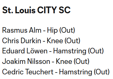 On a scale from 1-10, my confidence in this predicted lineup is a 2. Here are the Sharpies: Burki, Totland, Kessler, Baumgartl, Morales, Reid, Hartel, and Klauss. The Raviolis aren’t just injured; they’re severely depleted in central midfield. Any combination of Klauss, Becher, Hartel, and Pompeu could make up the forward line. However, St. Louis can start both first-choice fullbacks. More of the same for the Raviolis: too many absences and a makeshift starting XI.