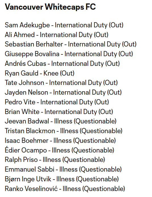 Gauld is the only player listed with an actual injury. Of course they’re playing the Sounders this weekend. They can’t keep getting away with it.