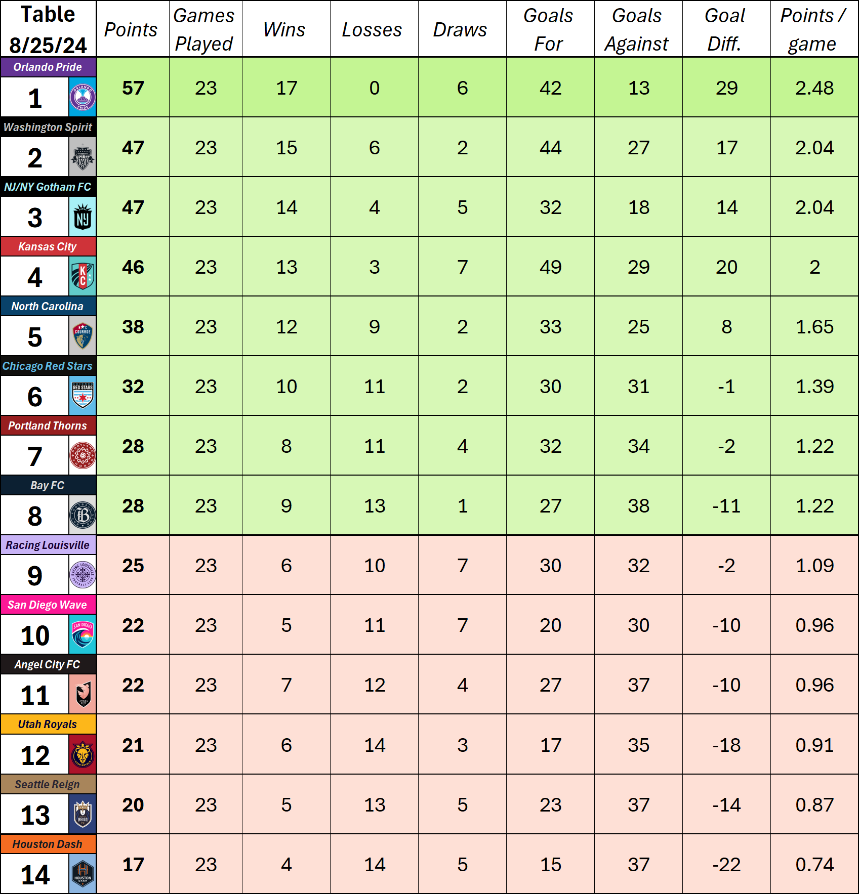 With the loss on Friday and the completion of the league’s matches over the weekend, the NWSL table looks like this: