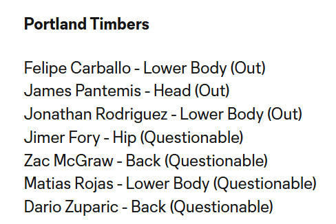 This report is full of surprises. Chief among them is Pantemis’ status. Rojas’ injury wasn’t a surprise given his halftime sub last weekend, but at least he’s questionable. Same with Zuparic, McGraw, and Fory.