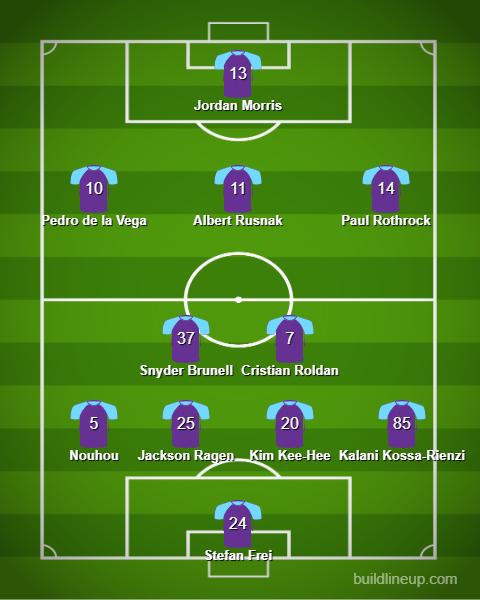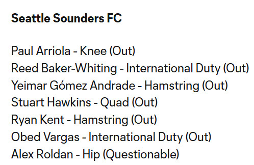 Kent hasn’t played since Phase One of Leagues Cup. Yeimar and Roldan got hurt last weekend against Vancouver, and the Colombian’s injury is serious enough to miss several weeks. Roldan is questionable, but I expect him to be in the matchday squad. Baker-Whiting and Vargas are at the U20 World Cup.