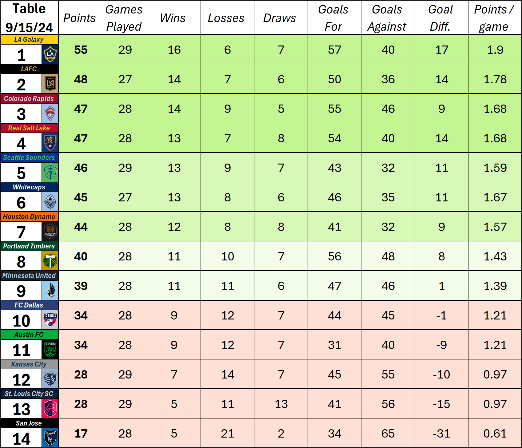 Seattle’s win propels them to 13-9-7 on the 2024 season, enough for 46 points and 5th place in the Western Conference. The Sounders are just a point back from both Colorado and Salt Lake.