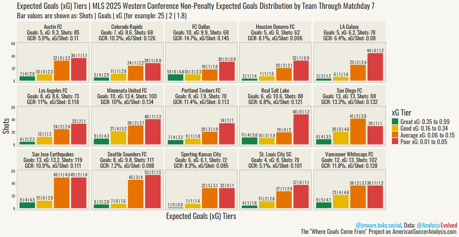 Before the data can be looked at, some basic stats need to be accounted for. The Timbers have taken the 4th-fewest shots in the Western Conference but they have the 4th-highest Goal Conversion Rate (GCR) in this sample. Basically, the Timbers should take more shots. Rodriguez’s return should be able to help with that. They’re matching their xG as well. Portland has a healthy amount of “Great xG” chances, a solid amount of “Good xG” chances, and a normal amount of average and poor xG chances. They’re being proportional. I wish this chart was more exciting, but it backs up the eye test.