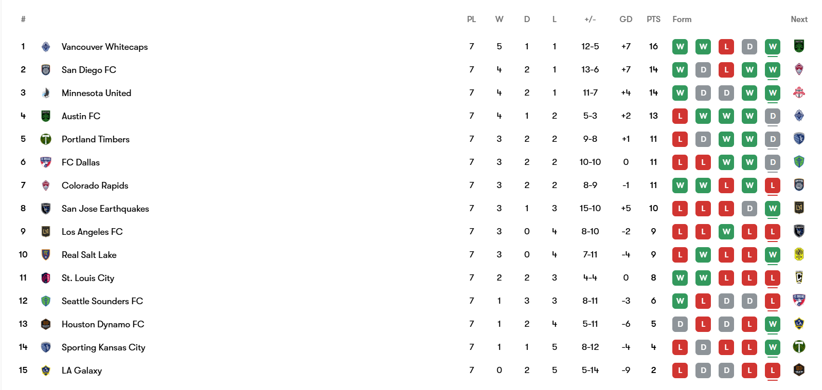 Vancouver faces Austin, and points will be dropped by someone. With a win, the Timbers could climb as high as second if other results go their way (San Diego and Minnesota losses). Of course, they should already be in fourth due to The Asterisk. A loss could see them tumble down the table. The West is another beacon of chaos. Nothing new.