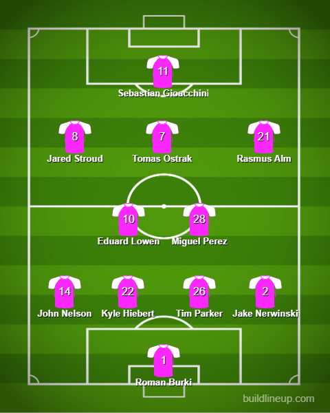 Their backline is fully rested, and I expect this exact backline to suit up Saturday night. The wings and forward spot is pretty settled as well. However, Lowen is the only midfielder I can confidently put in the XI. Perez played the full 90 against Omaha, and Ostrak usually plays out wide. He could be swapped out for another striker in Carnell’s preferred 4-2-2-2. Celio Pompeu was the man of the match in their Cup tie, and Bradley Carnell could opt to ride with a confident young forward at home. Perez could start alongside Lowen, or it could be Indiana Vassilev in that role, but I’m projecting Perez in the XI due to Vassilev leaving the field with a knock in the Open Cup match. This XI is St. Louis’ best available players.