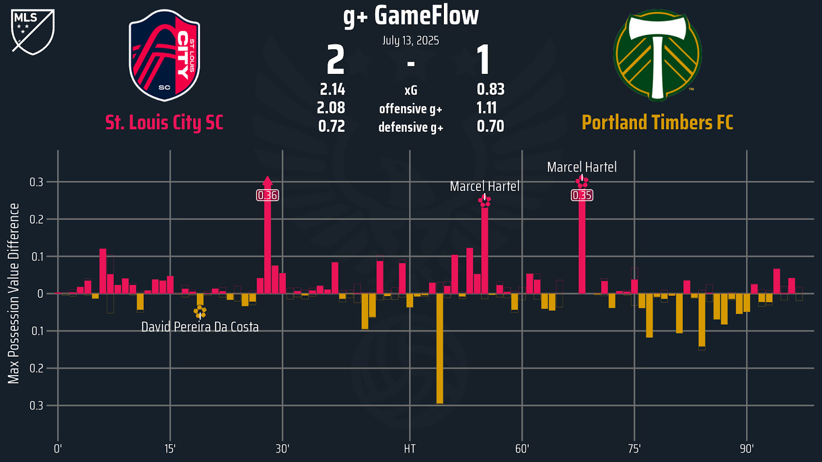 St. Louis was widely regarded to be a playoff team during the preseason. A strong summer transfer window in 2024 injected a ton of new talent into a team that regressed to the mean after a massive overperformance in 2023. But the injuries struck and a bad head coaching hire saw them spiral down the table during the first half of 2025. In particular, the absence of Eduard Lowen (not a DP anymore but their best field player) left them rudderless. Lowen made his return tonight, and the Raviolis are now 4-2-1 when he plays in 2025. All four of their wins are directly correlated to Lowen being on the field. He’s a floor-raiser of the highest order in this league. The Timbers needed to do the majority of their damage tonight when he was off the pitch. They didn’t, and got punished for it.