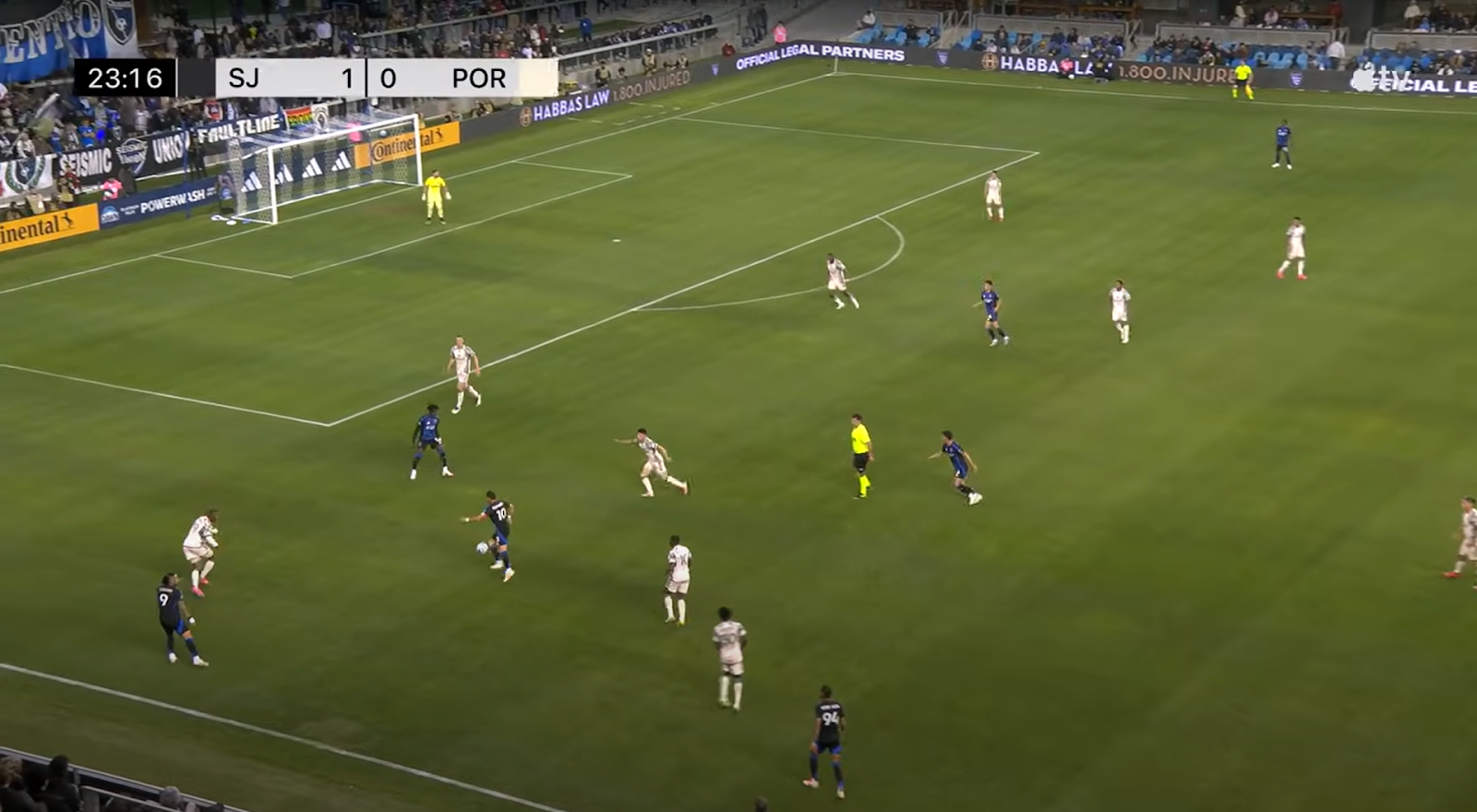 The Earthquakes gave the Timbers a taste of what was to come in the first 15 minutes. Every single Portland turnover was an invitation for San Jose to counterattack. In a span of 9 minutes (from minutes 16-27), the Earthquakes scored 3 goals. I don’t need to describe each one because I’ll be going into full detail on those. Portland was woefully unprepared to deal with San Jose’s lightning-fast counters. They also struggled with another feature of this Earthquakes team that I’ll discuss along with those concessions. But right before halftime, the Timbers got some hope. A long ball from Claudio Bravo turned into a footrace between Antony and rookie center back Max Floriani. The Brazilian laid it off to David Da Costa, who drove into the box and squared it to Felipe Mora. The Chilean ghosted in front of Dave Romney and roofed it into the net with the outside of his boot. Portland entered halftime down 1.05-0.94 on xG, outshot 9-7 (5-2 on target), and down 3-1.