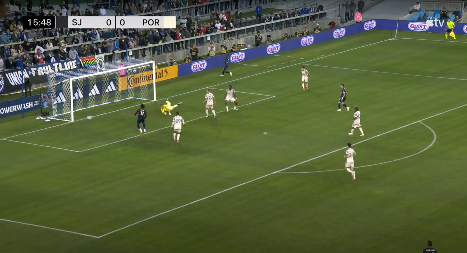 Thank you Claudio Bravo, the unofficial linesman. Arango is correctly judged to be offside, but this is way too easy for San Jose. Portland committed too many bodies forward (I get it, you’re trying to score a goal and get back in the game) but allowing another runway down San Jose’s left side is abhorrent.