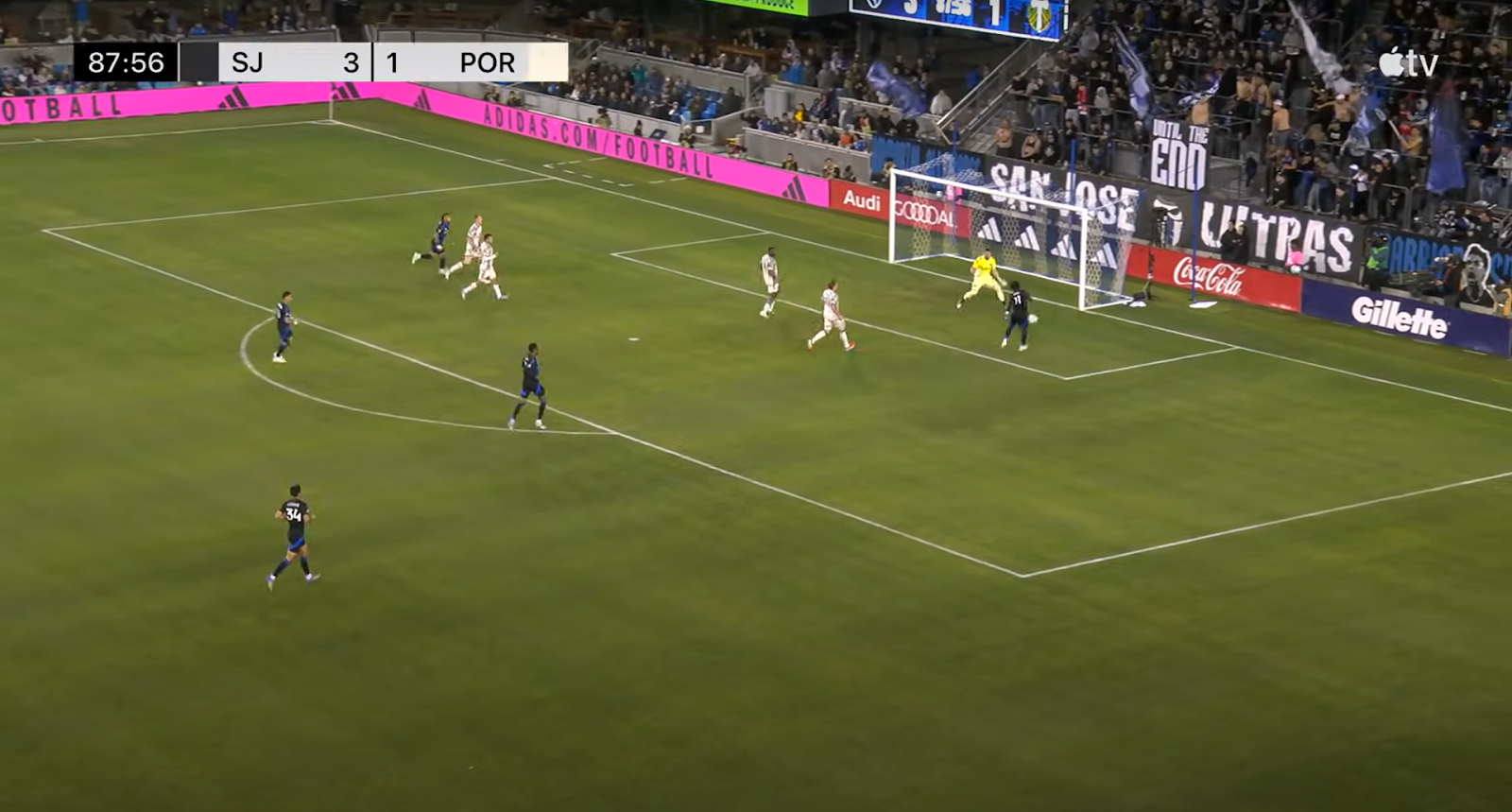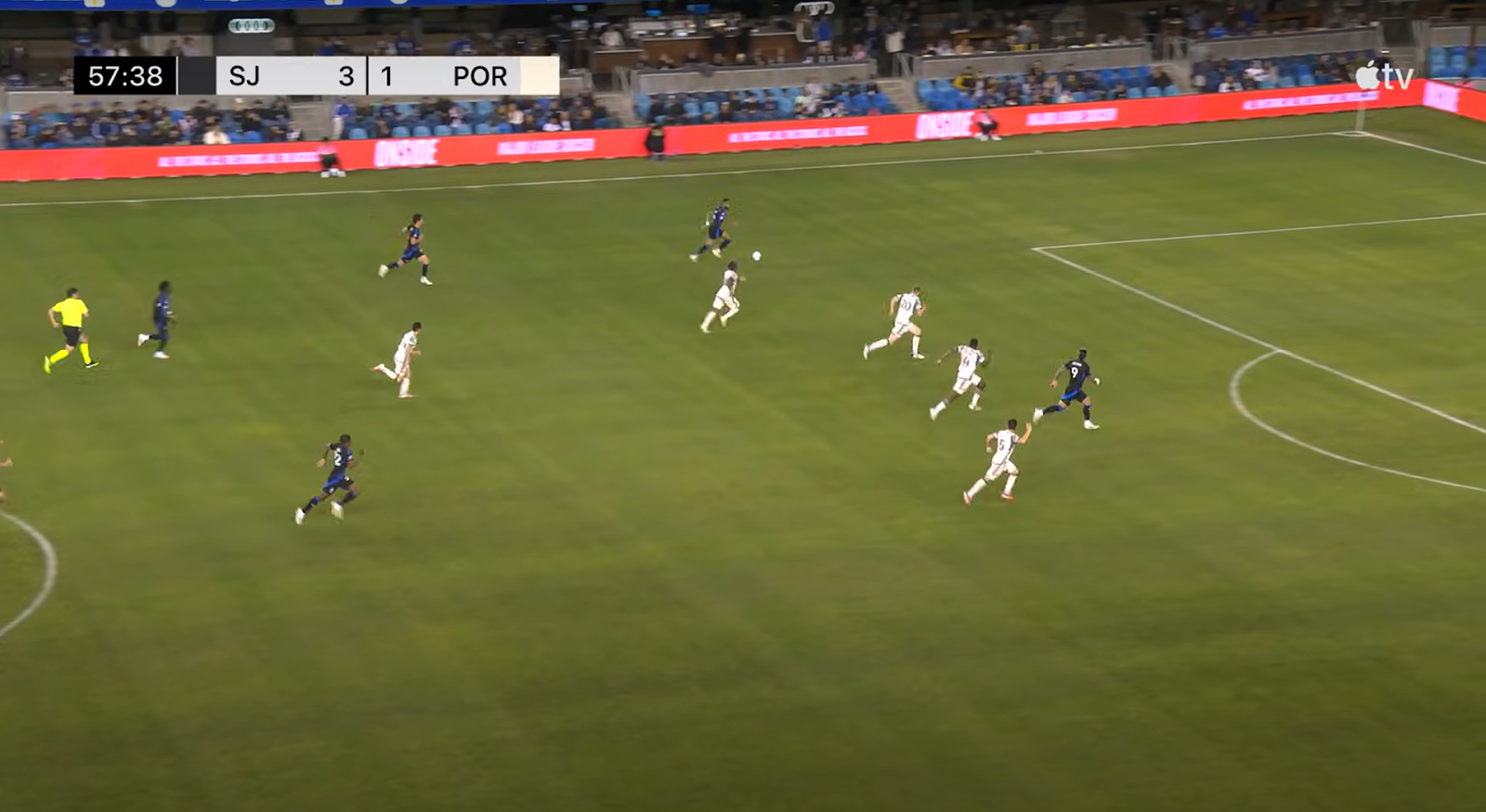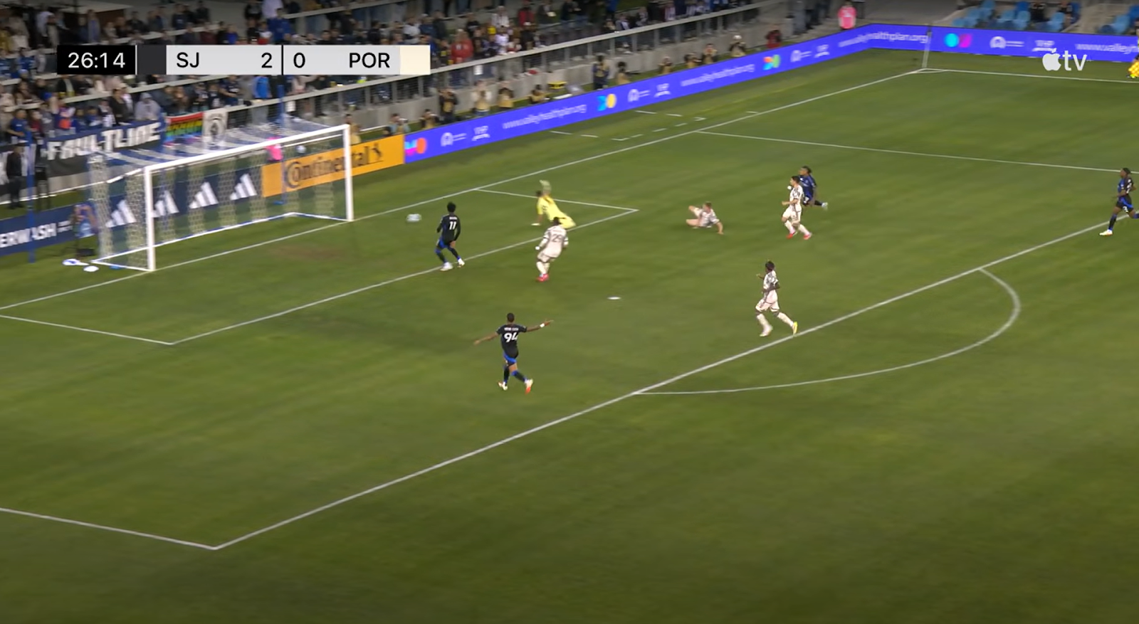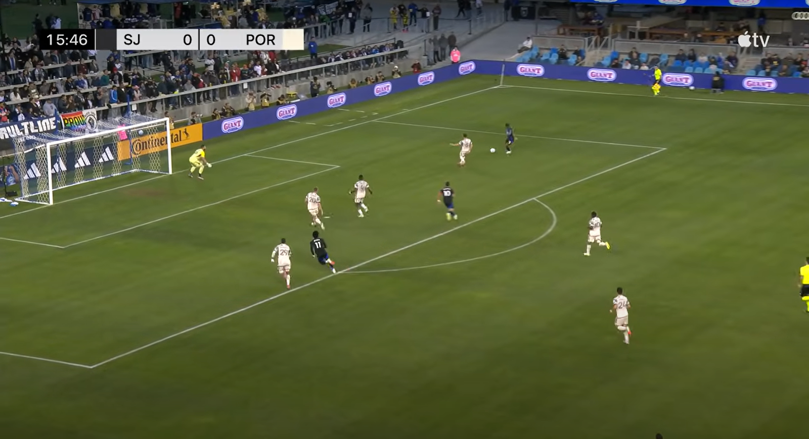 Let’s catch up. The Timbers properly cleared a free kick and began a counter. However, a heavy Santiago Moreno touch led to another turnover. Now San Jose is rushing back the other way. It’s a counter-to-counter scenario. Notice Juan Mosquera. He’s directly underneath the time clock. That’s very far behind the play. Bouda is about to play a through ball. I wonder who he’s passing it to?