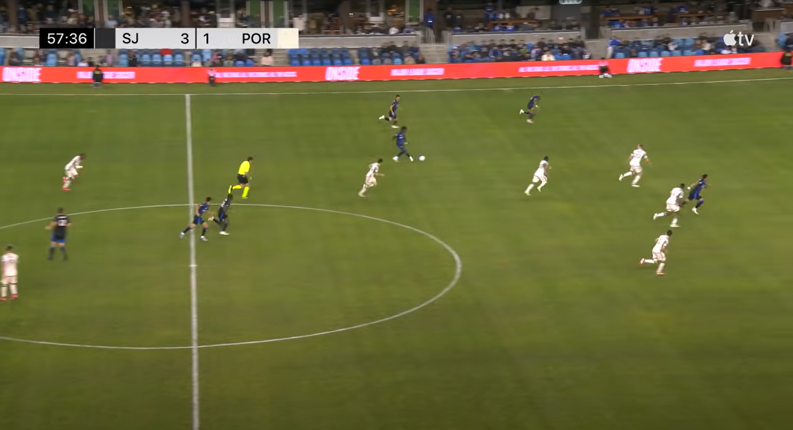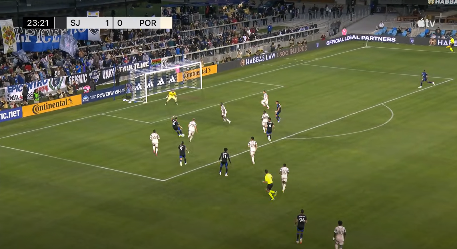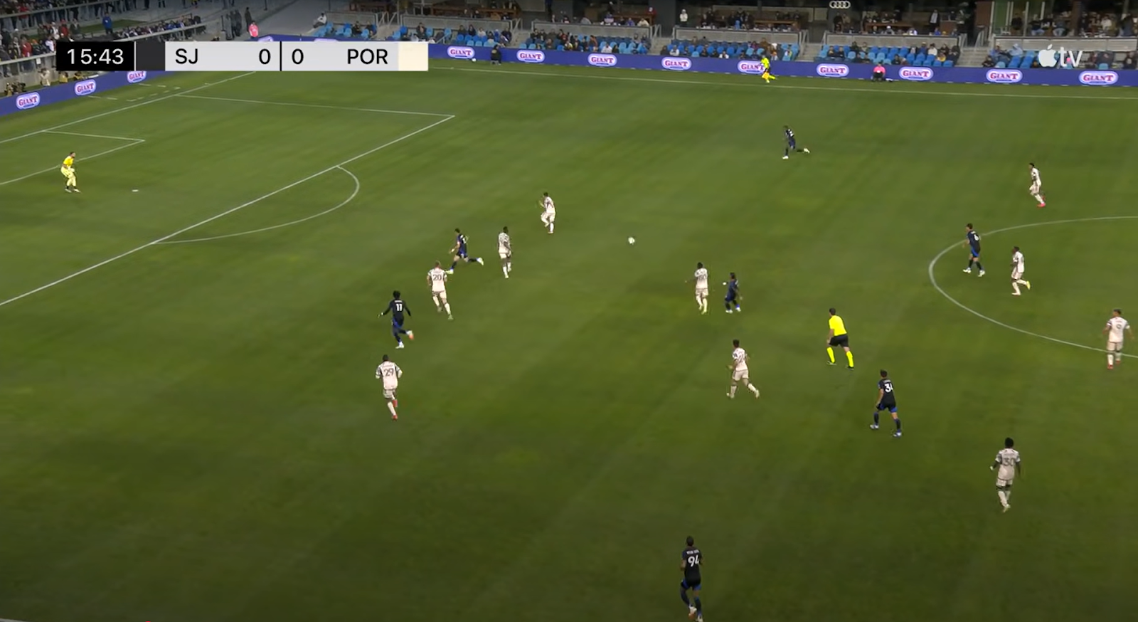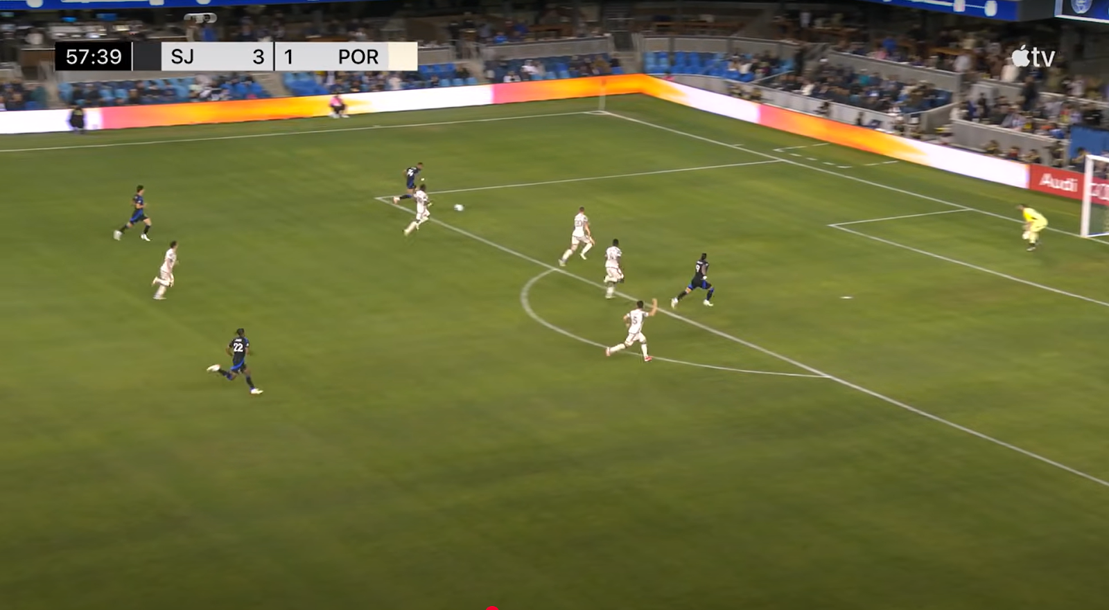 Let’s catch up. The Timbers properly cleared a free kick and began a counter. However, a heavy Santiago Moreno touch led to another turnover. Now San Jose is rushing back the other way. It’s a counter-to-counter scenario. Notice Juan Mosquera. He’s directly underneath the time clock. That’s very far behind the play. Bouda is about to play a through ball. I wonder who he’s passing it to?