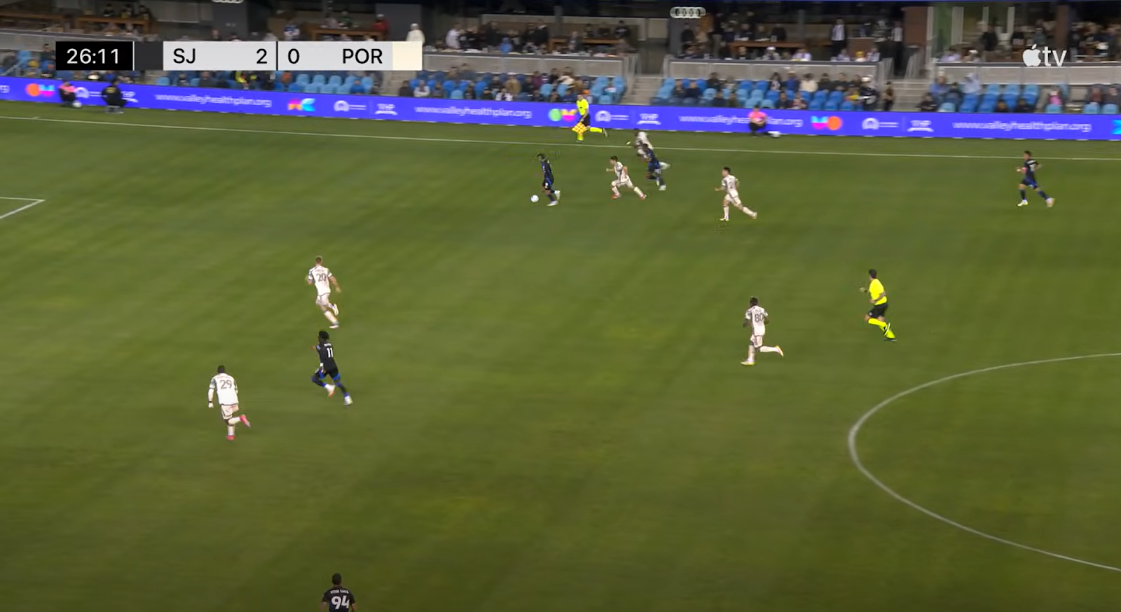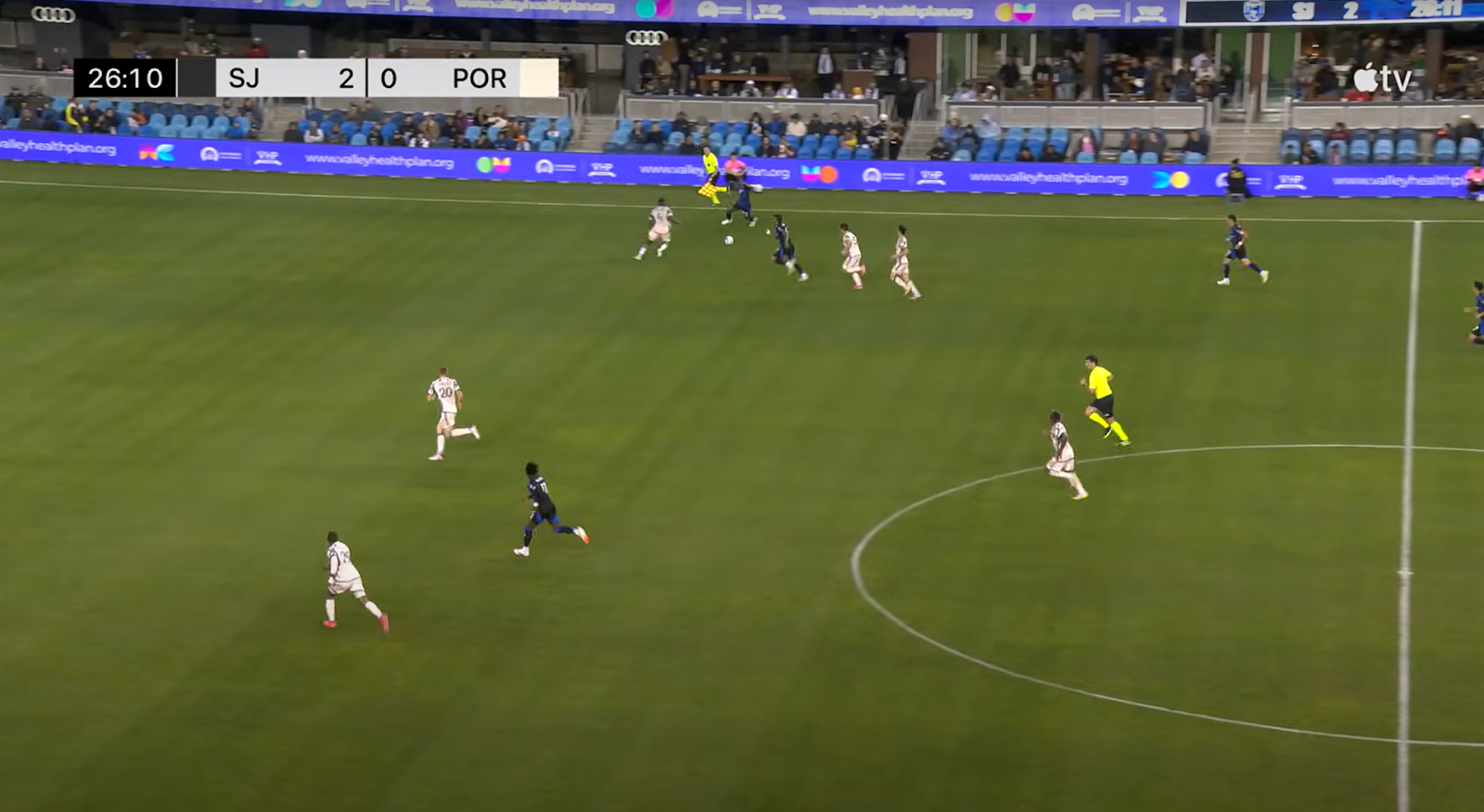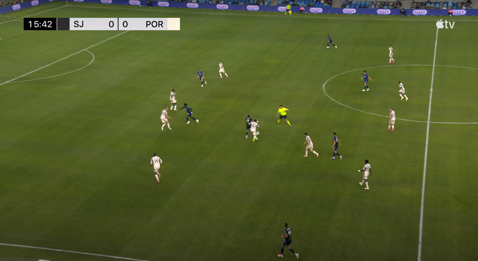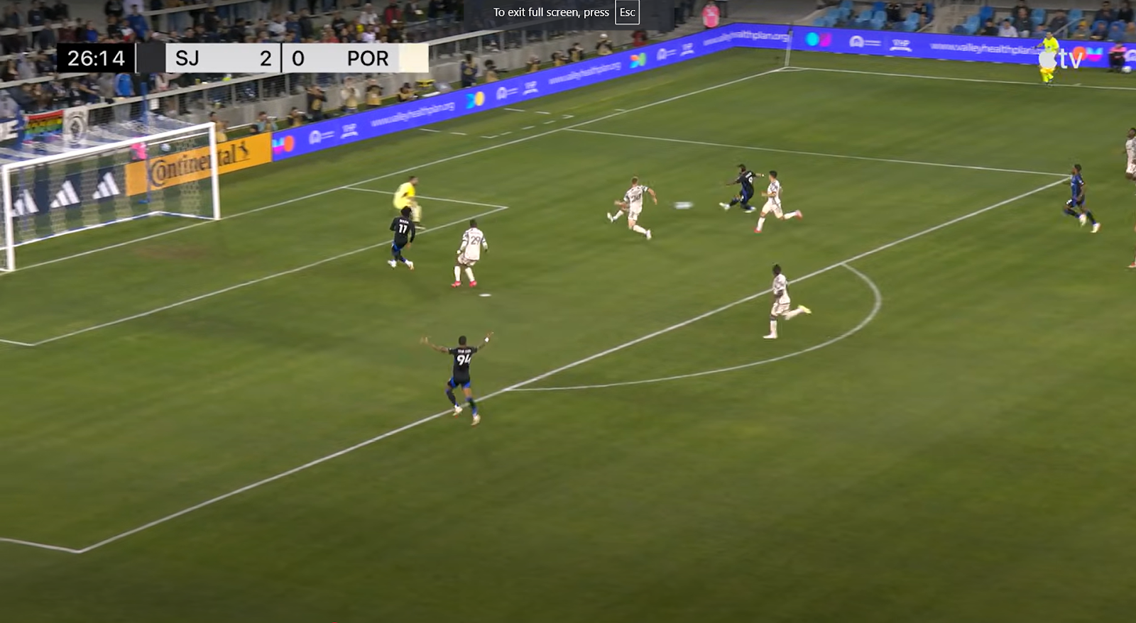 Let’s catch up. The Timbers properly cleared a free kick and began a counter. However, a heavy Santiago Moreno touch led to another turnover. Now San Jose is rushing back the other way. It’s a counter-to-counter scenario. Notice Juan Mosquera. He’s directly underneath the time clock. That’s very far behind the play. Bouda is about to play a through ball. I wonder who he’s passing it to?