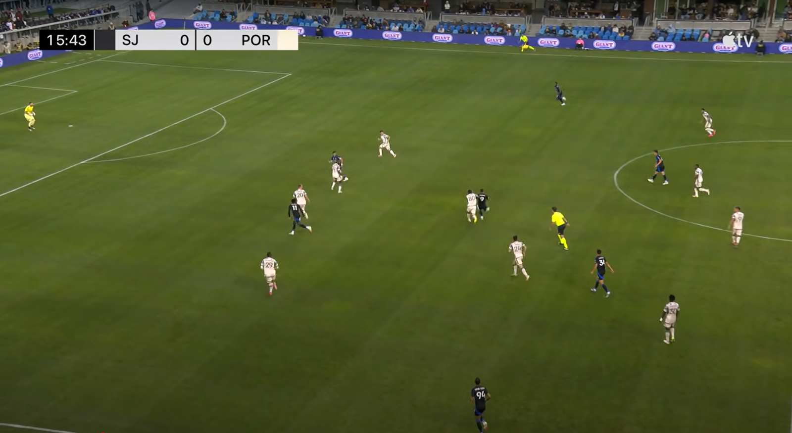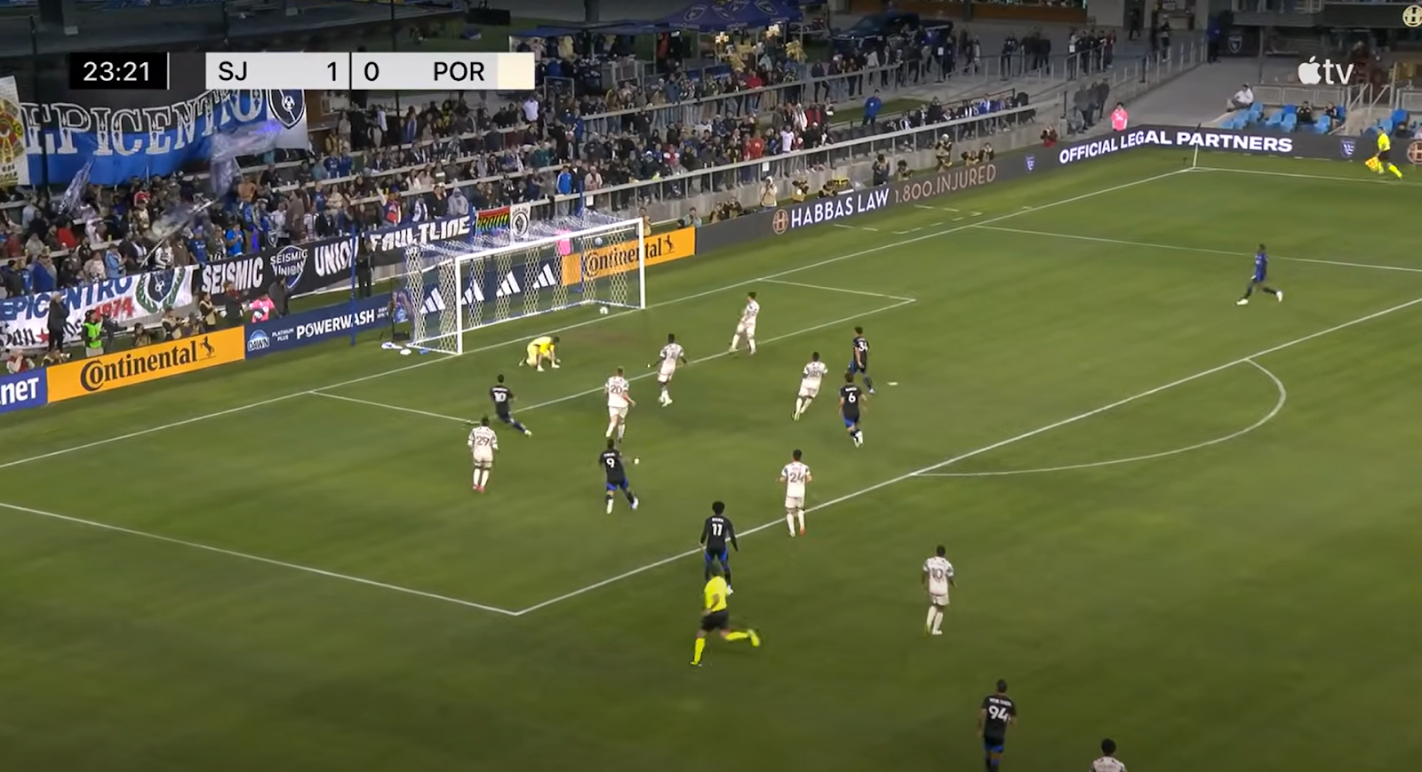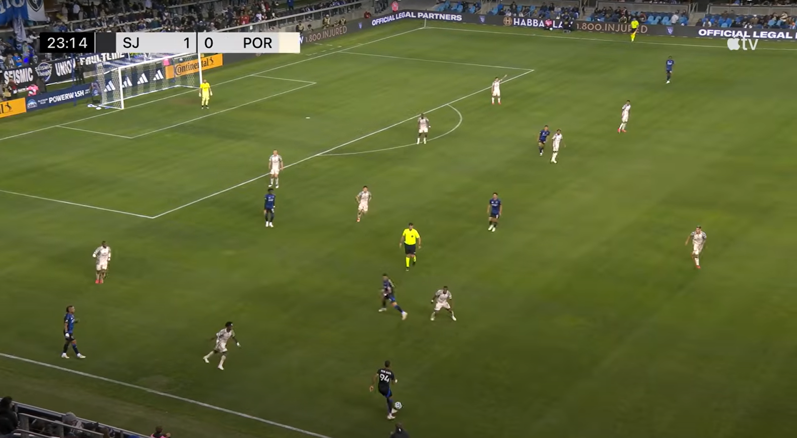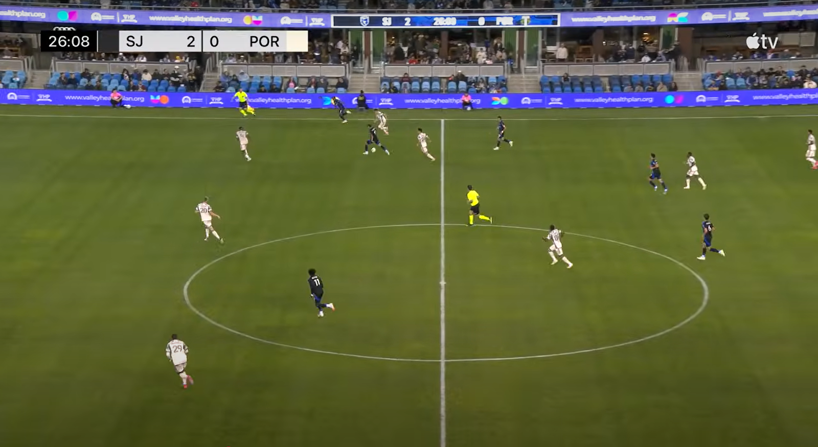 Let’s catch up. The Timbers properly cleared a free kick and began a counter. However, a heavy Santiago Moreno touch led to another turnover. Now San Jose is rushing back the other way. It’s a counter-to-counter scenario. Notice Juan Mosquera. He’s directly underneath the time clock. That’s very far behind the play. Bouda is about to play a through ball. I wonder who he’s passing it to?
