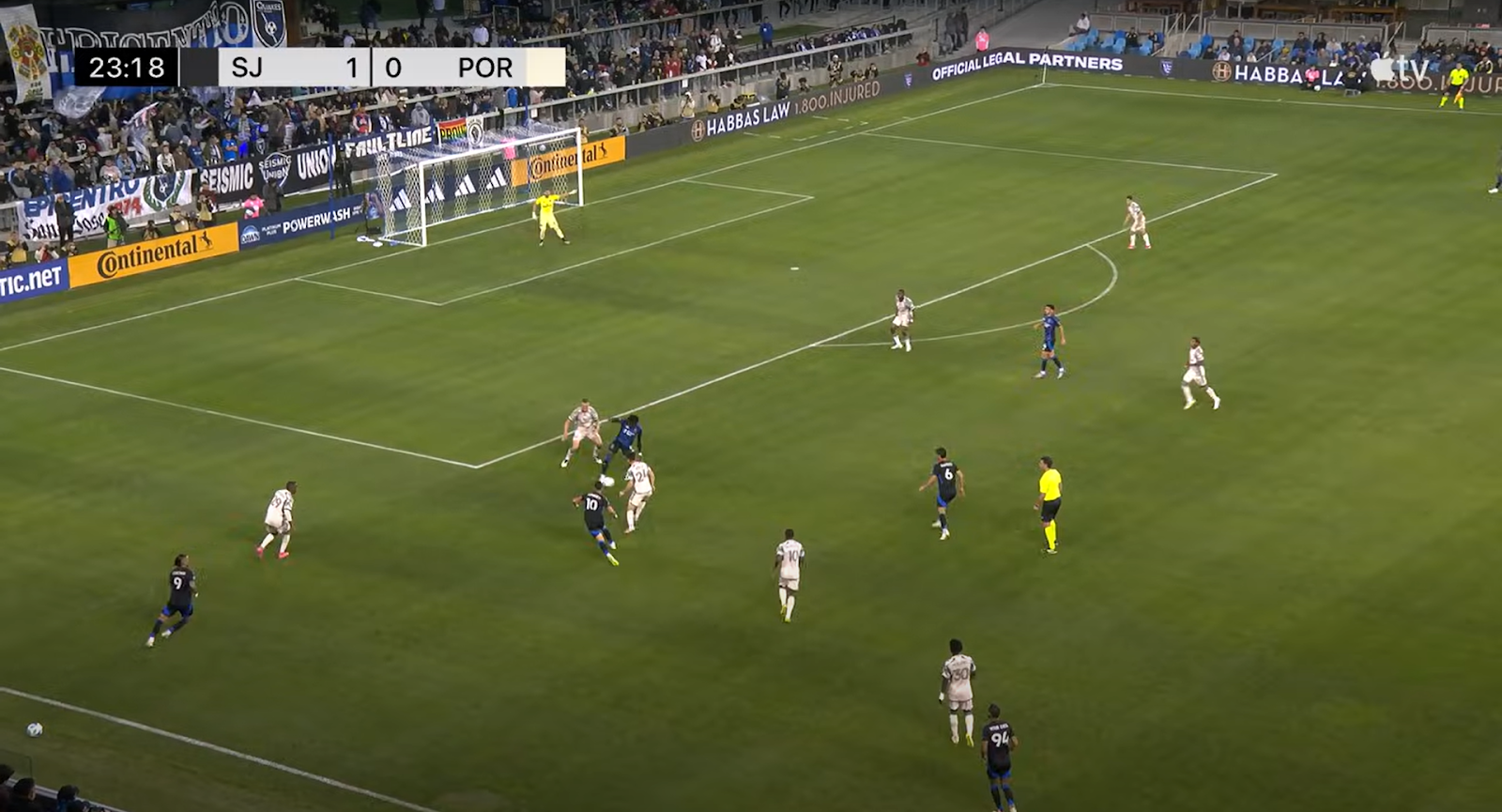 San Jose’s pressure evaporated at the start of the second half as they sat deep to protect their lead. Despite having 60% of the ball and taking 10 shots, the Timbers failed to generate a single “big chance.” In the first half, the Timbers missed 2 of their 3 “big chances.” However, in the 58th minute, an unchallenged cross from Vitor Costa made contact with Finn Surman’s outstretched leg. Unfortunately, that contact from Surman’s leg wasn’t enough to change the path of the ball, and it fell right into Chicho Arango’s lap for the easiest finish of the night. But VAR official Younes Marrakchi noticed something was wrong, and sent referee Fotis Bazakos to the monitor. Upon review, Arango was judged to be in an offside position, and the goal was removed. Back to 3-1. This was the correct call, and the review process that was undertaken to arrive at that conclusion was a shining example of what VAR should be. Quick, efficient, and resulting in the correct outcome. However, it wouldn’t be the only time that VAR would be utilized during this match.