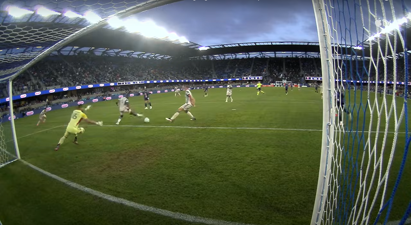 This angle from behind the goal provides more clarity. Miller’s momentum is taking him in the opposite direction, Surman is too far away to attempt a normal block, and Crepeau is daring Espinoza to try for the far post based on his positioning. This goal gets a “yikes” rating. Very preventable, but the finish is superb. However, the Timbers presented San Jose with a perfect platform to score this.