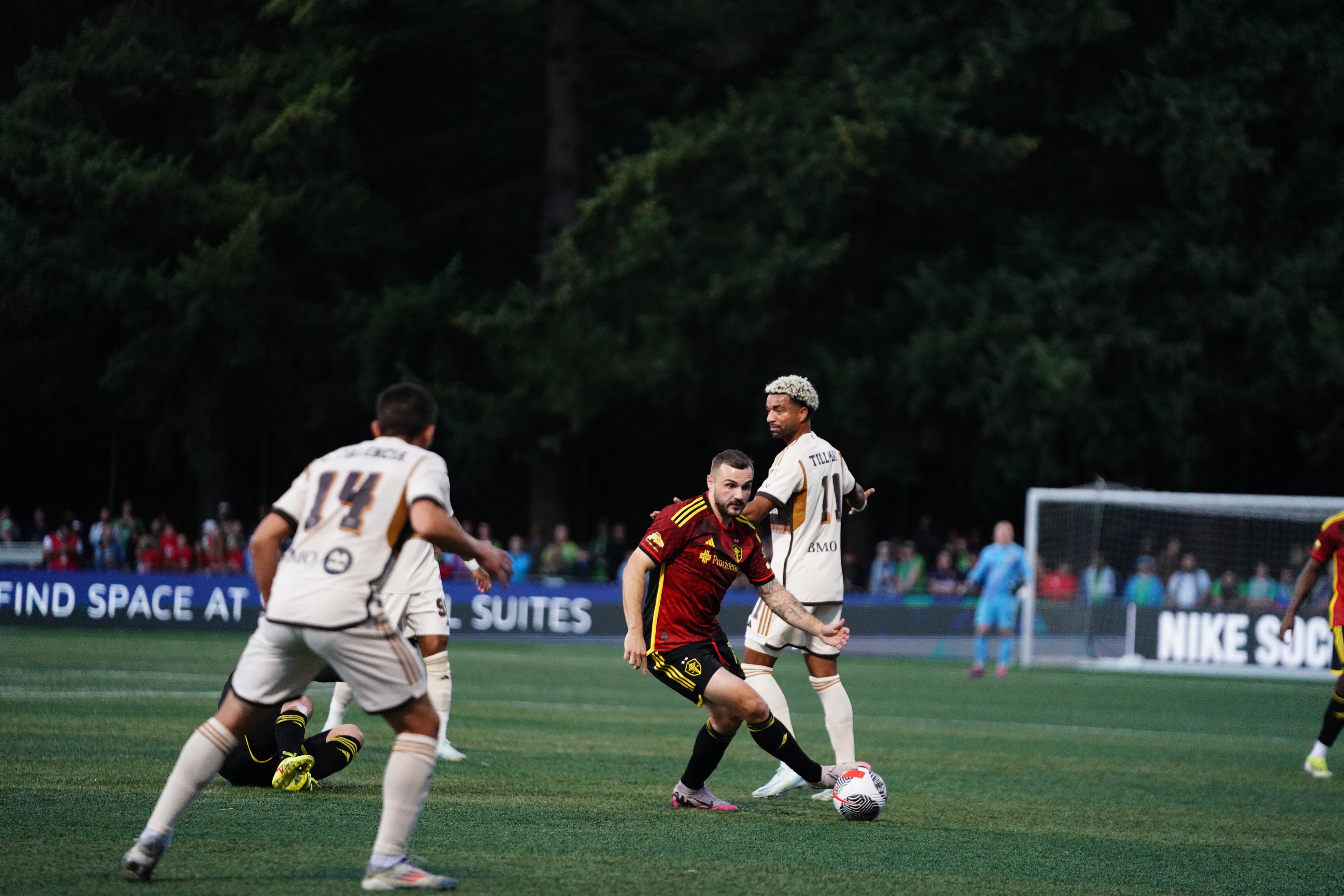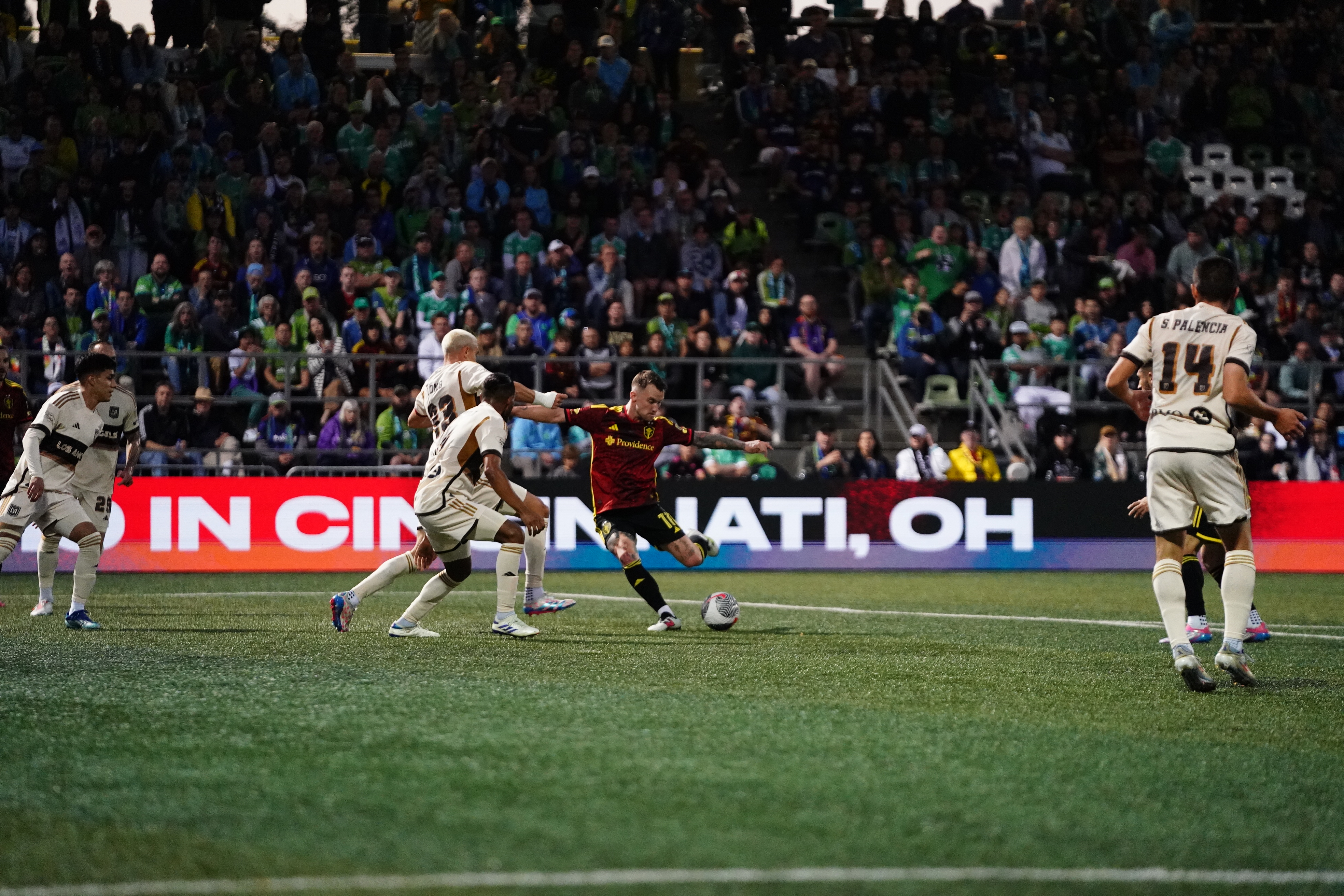The Sounders did a solid job keeping LAFC quiet for most of the match. They even looked like the more dangerous side through the first 45 minutes. The Brothers Roldan pretty effectively limited what danger Bouanga was able to create, and despite a shift in possession in favor of LAFC, that possession did not end in any real threat. The most significant chance for either side in the first half fell to Father Time, Kei Kamara, on a volley following a set piece (this looked too familiar). This time, instead of a goal, his rocket met the giant head of Jackson Ragen, who managed to clear the ball on the goal line to preserve the 0-0 scoreline in the 40th minute.