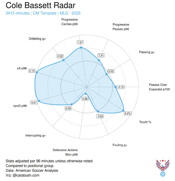 This radar is taken from 2025, when Bassett played all over the field. In 2024, Bassett had the most cumulative g+ (goals added) among all MLS defensive midfielders. 31% of that total belonged to one category: receiving.